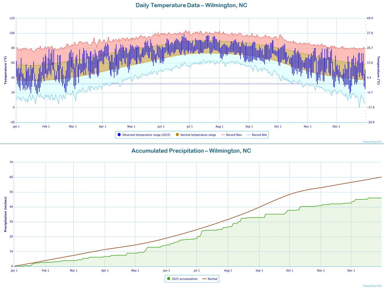 2025 Temperature and Rainfall summary for Wilmington, NC |