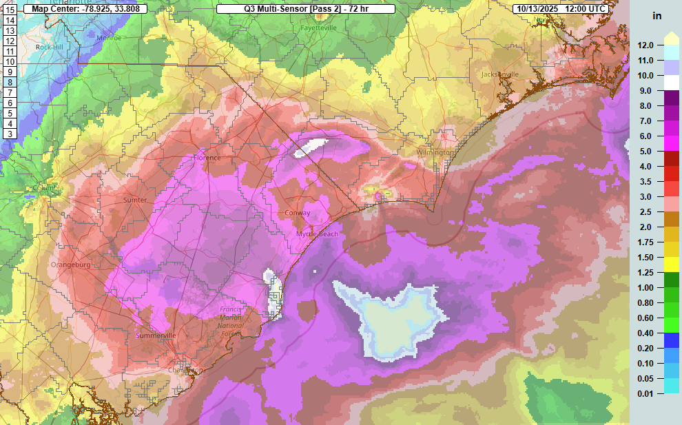 Multi-Radar Multi-Sensor (MRMS) 72-hr rainfall estimate from 12 UTC (8 AM EDT) October 10 to 12 UTC (8 AM EDT) October 13 across southeast NC and northeast SC |