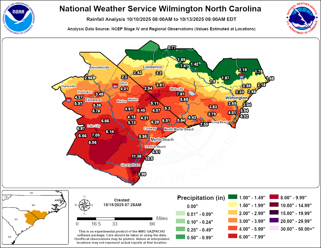 72-hr precipitation analysis from 12 UTC (8 AM EDT) October 10 to 12 UTC (8 AM EDT) October 13, 2025 across southeast NC and northeast SC |
