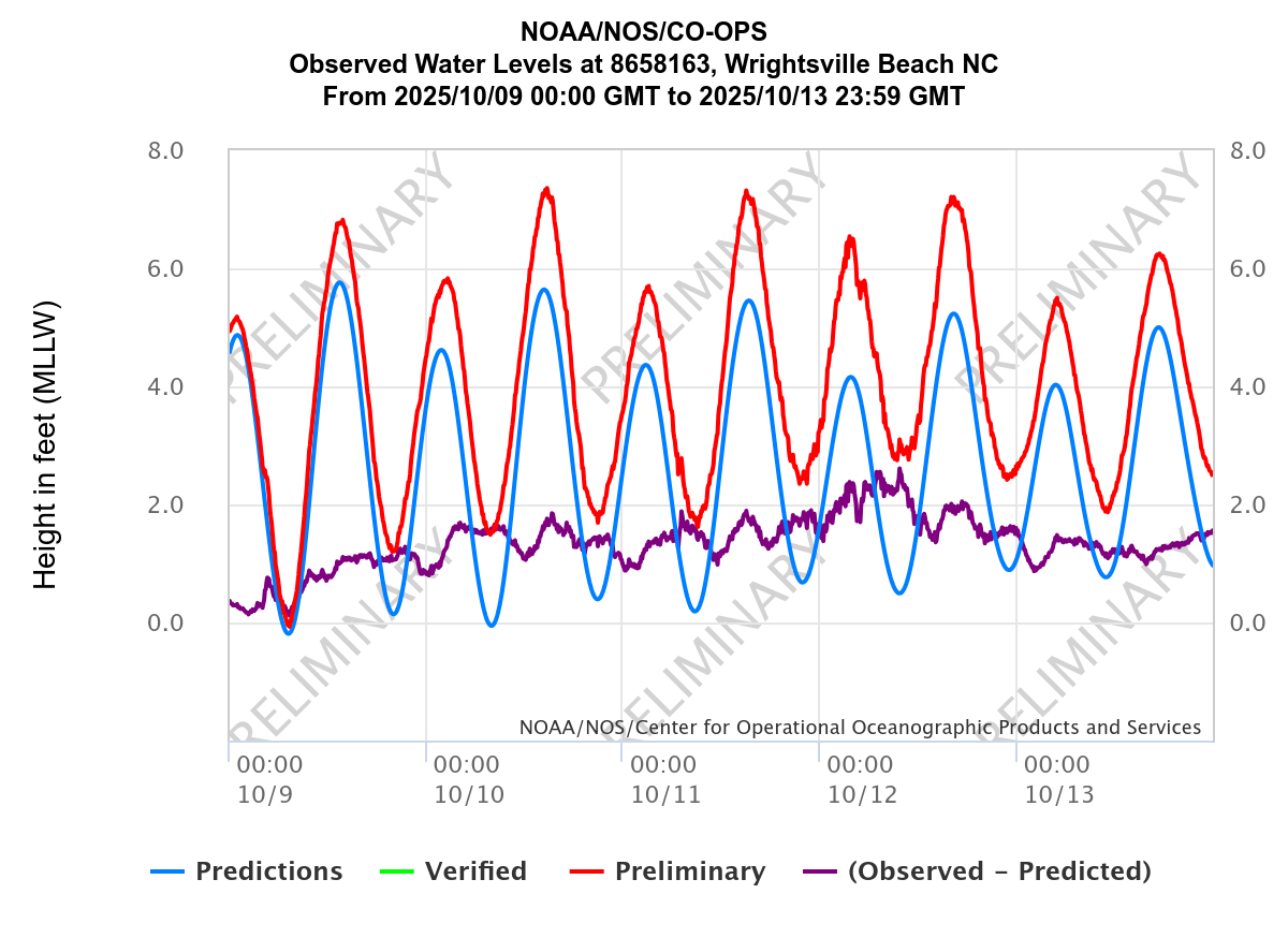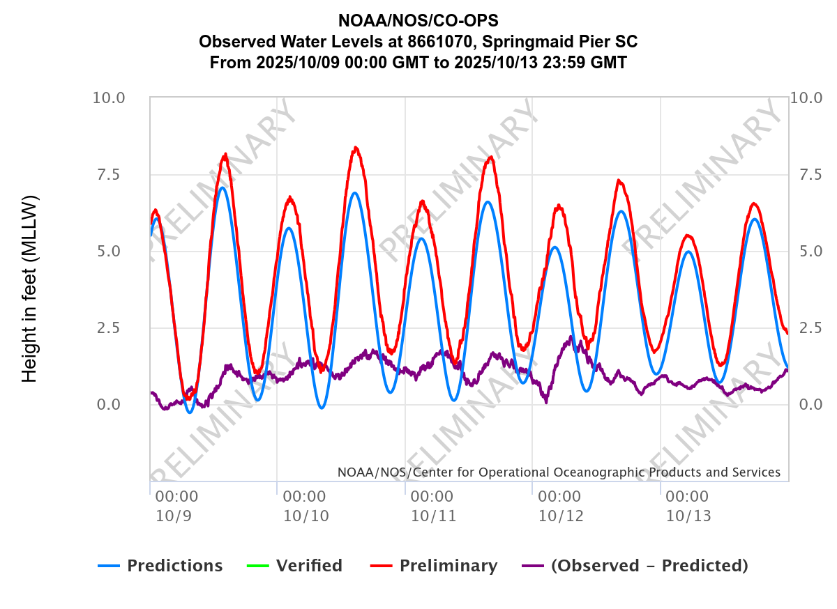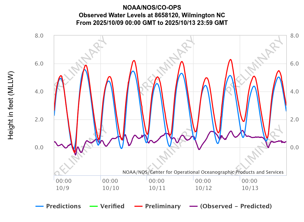 The full moon on October 6 and lunar perigee on October 8 led to higher than normal astronomical tides even before the stronger north to northeast winds occurred as the coastal storm developed and tracked close to the coast. Several days of minor tidal flooding occurred along the southeast NC and northeast SC coasts with water levels peaking during the high tide Friday (Oct 10) morning at Springmaid Pier (8.38 ft above MLLW / 2.78 ft above MHHW), which was just shy of moderate flood levels, and at Wrightsville Beach (7.36 ft above MLLW / 2.85 ft above MHHW). A look at some of the flooding along the Grand Strand can be found here. At Wilmington, the lower Cape Fear River tide peaked at 6.29 ft above MLLW (1.61 ft above MHHW) during the afternoon high tide on Sunday (Oct 12) which led to minor tidal flooding. NOTE: The MHHW (Mean Higher High Water) level is a proxy for the level where inundation typically begins.