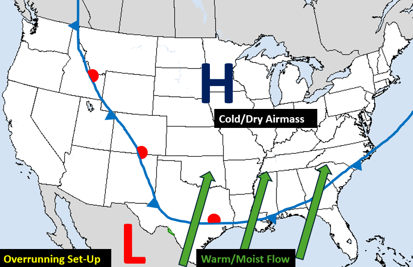 An overrunning event occurs when warm/moist air from the Gulf is forced up and over an Arctic airmass. As the air rises, it condenses into cloud cover and eventually results in precipitation. Below is a synoptic weather map depicting the set-up for this situation. A very cold airmass was in place across much of the country east of the Rockies...with strong high pressure anchored over the Upper Midwest providing a dry northeasterly flow. Meanwhile an upper-level low tracking across northern Mexico was enhancing southerly flow from the Gulf up and over the frontal boundary stalled in the Deep South.