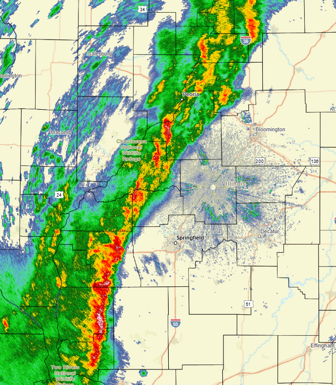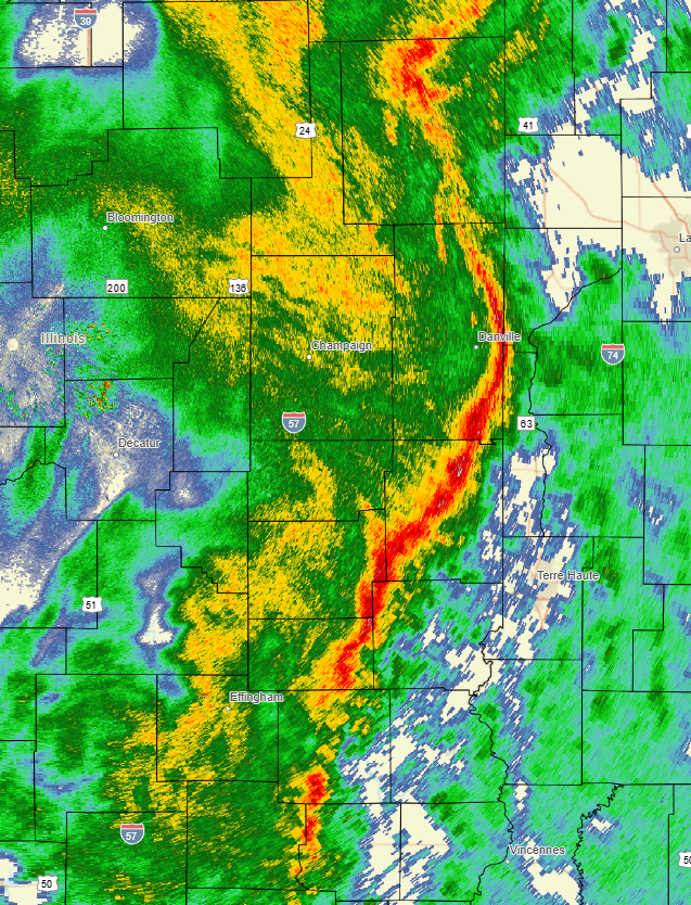 Once the storms became better organized, the line of convection advanced east-northeastward at 50-55mph for the remainder of the afternoon into the early evening. As is typically the case with a Quasi-Linear Convective System (QLCS) or "squall line," numerous kinks and notches were observed along the leading edge. These are key locations for potential tornadic development and were carefully monitored by NWS radar operators throughout the event. A number of Tornado Warnings were issued accordingly. In addition, a portion of the line began bowing forward...indicative of a powerful rear-inflow jet accelerating the storms forward and creating damaging wind gusts of greater than 70mph. In the 6:59pm radar image, note the prominent bowing segment exiting Moultrie County and pushing into western Douglas and Coles counties. Also observe the jagged nature of the entire line, signaling the potential for quick spin-up tornadoes.