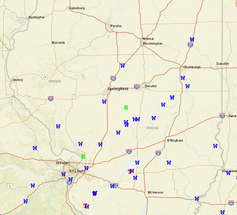 As the low tracked northeastward and pulled its trailing cold front across west-central Illinois, a broken line of thunderstorms developed by mid-afternoon. The storms were initially sub-severe in the more stable environment north of the Saint Louis area: however, one cell eventually strengthened and prompted NWS Lincoln to issue the first Severe Thunderstorm Warning for portions of Scott, Morgan, and western Sangamon counties at 4:16pm CDT. The radar image below shows a disorganized line of convection from Lacon...to Peoria...to near Petersburg...with stronger cells capable of damaging wind gusts in excess of 60mph across Morgan, Greene, and Jersey counties.