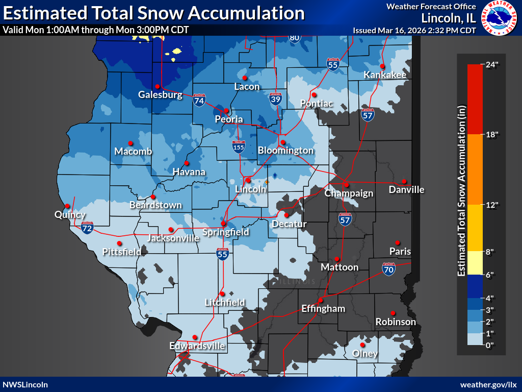 The snow continued throughout the night, then tapered off to snow showers by the morning of March 16th. Storm total snowfall was generally around 1 inch along the I-55 corridor...but increased to 2-4 inches in the Illinois River Valley. Very strong west-northwest winds gusting 40-50mph caused blowing snow, significant visibility reductions, and near blizzard conditions in open areas along and northwest of a Havana to Minonk line. The winds remained strong and gusty through the afternoon of the 16th, resulting in continued blowing and drifting snow mainly in rural locations. Numerous traffic accidents were reported and parts of I-39 in Woodford County had to be closed.