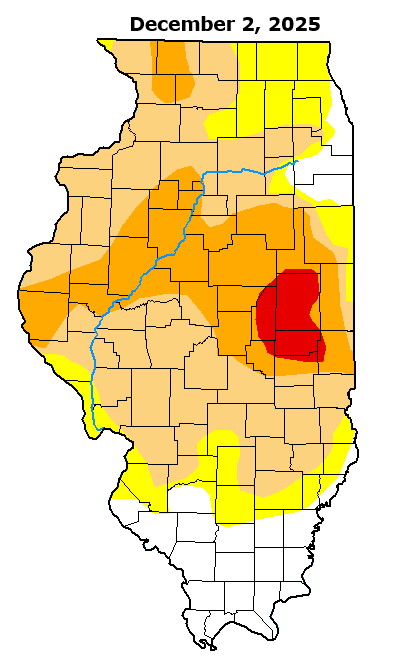 Drought conditions developed across east-central Illinois during the spring of 2025, then steadily worsened and spread across the remainder of central Illinois during the late summer and fall. While July offered a temporary respite from the dryness, rainfall decreased and drought conditions quickly engulfed the entire region by September and October. By the November 4th U.S. Drought Monitor issuance, the majority of central Illinois north of the I-70 corridor had deteriorated into the Severe Drought (D2) category...with a pocket of Extreme Drought (D3) noted across parts of Champaign and Piatt counties. While several storm systems brought heavy snowfall and much-needed moisture from the end of November into the middle of December, significant moisture deficits still exist and very little drought improvement has been noted through December 15th.