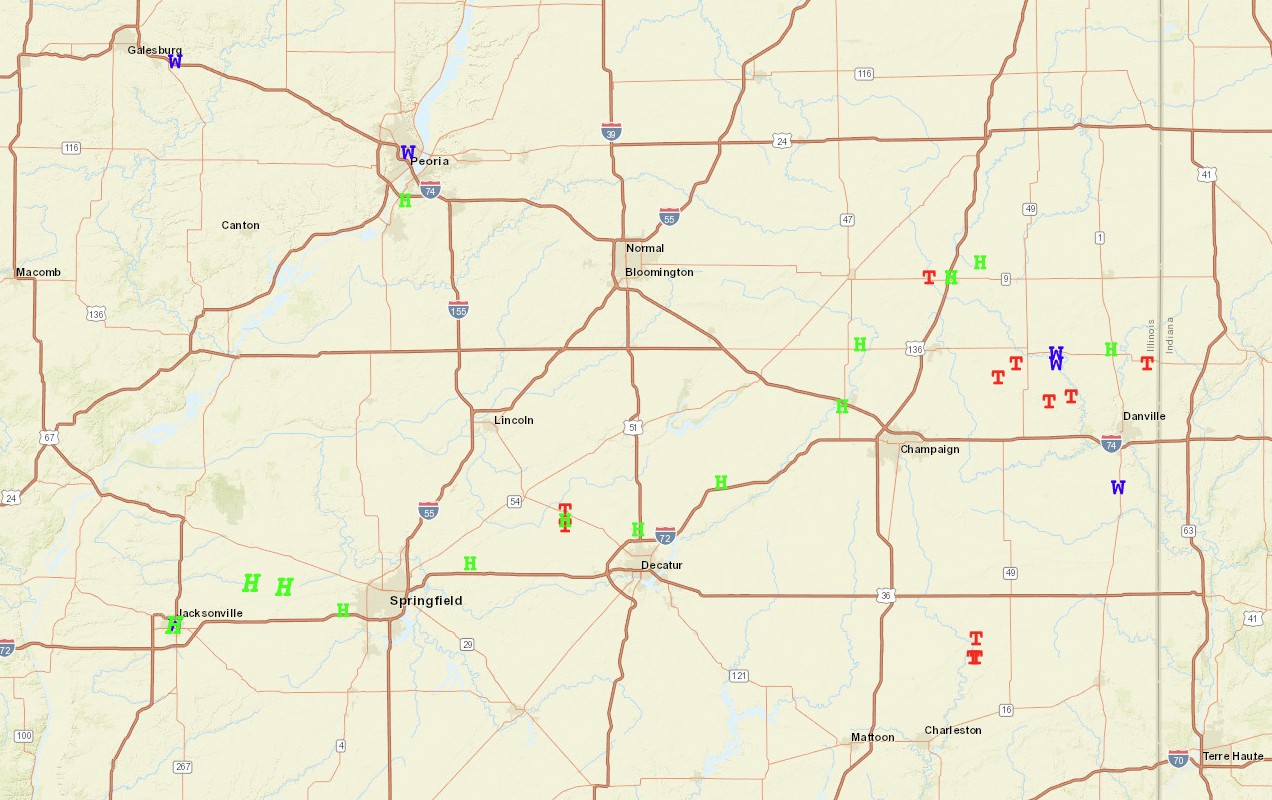ROUND 1 occurred during the morning when a line of thunderstorms along the trailing cold front pushed into the Illinois River Valley. These storms were generally sub-severe, but one cell produced a downburst with estimated winds in excess of 70 mph across parts of Logan County...downing a few trees, tearing the roof off a business, and flipping 3 semis in and near Lincoln.