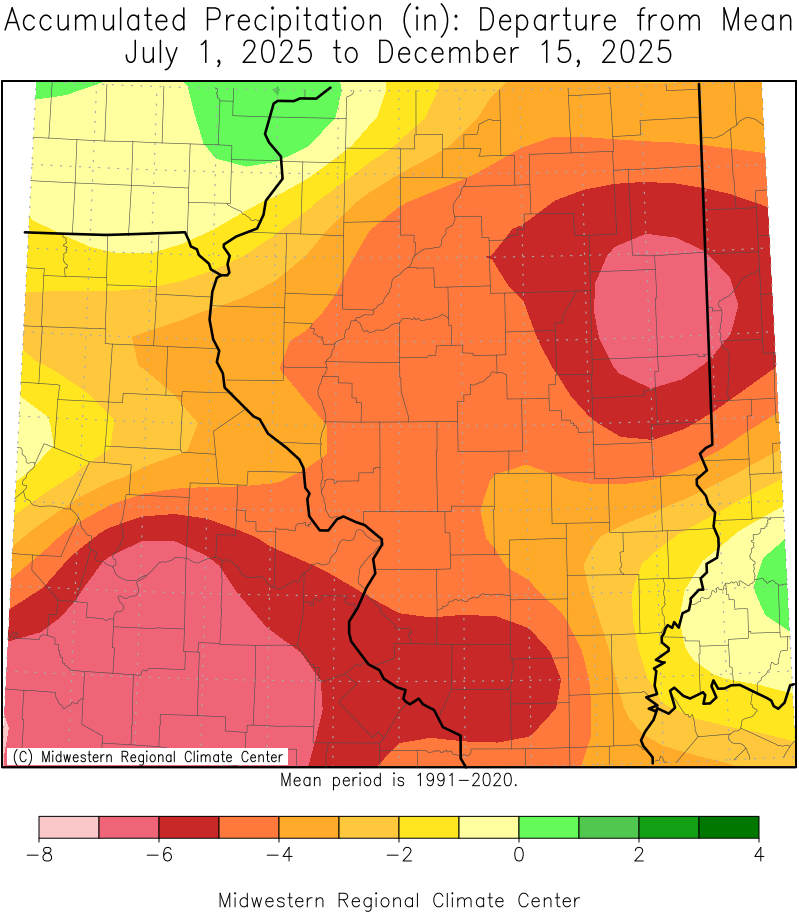 This image from the Midwest Regional Climate Center (MRCC) shows the departure from mean precipitation from July 1st through December 15th. Note the bullseye over Champaign County indicating a deficit of over 7 inches during that time.