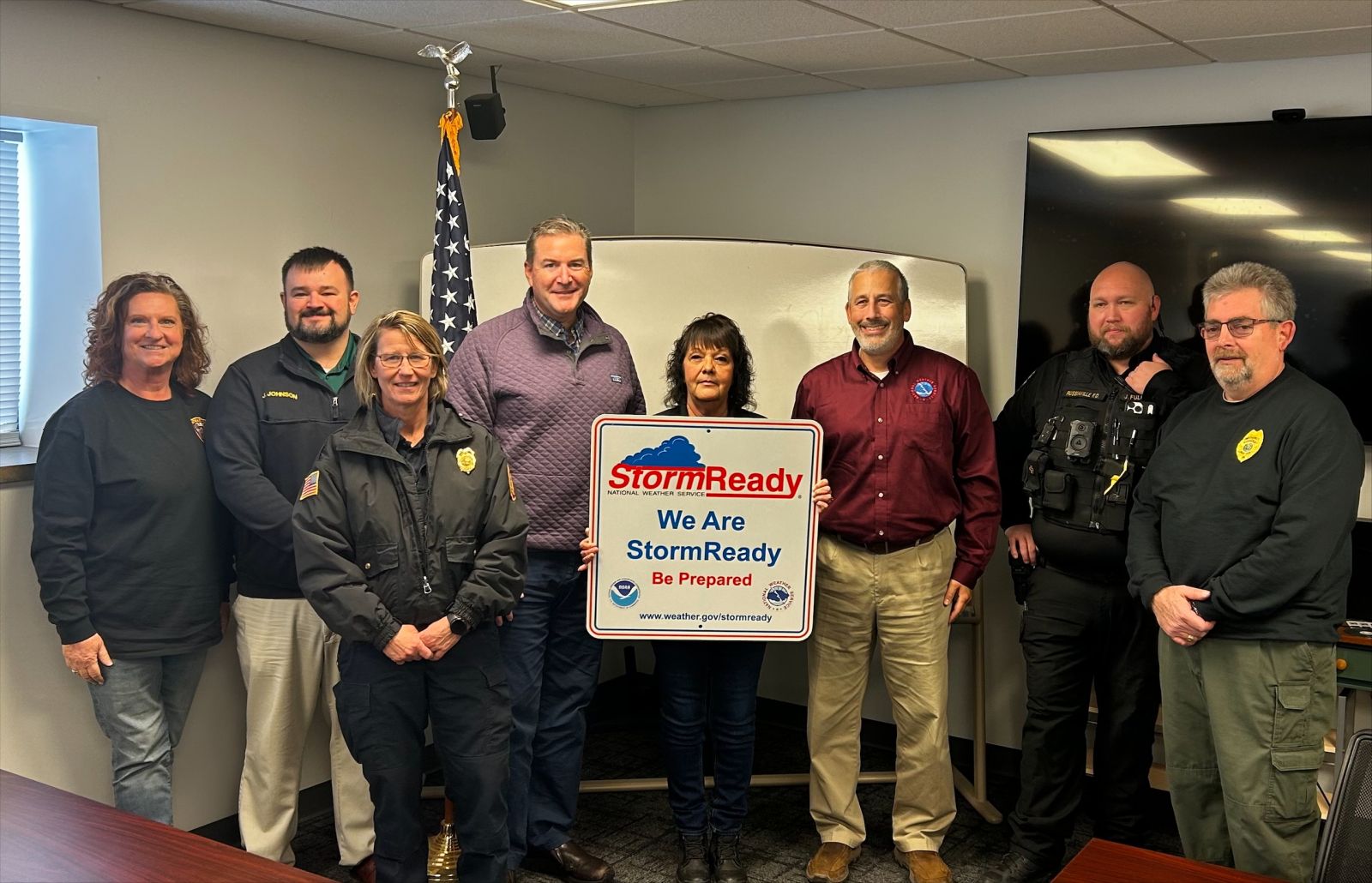 Photo: David Beachler (Left Center) Acting MIC for NWS Indianapolis and Senior Meteorologist Mike Ryan (Right Center) present Howard County Emergency Management Director Janice L. Hart (Center) with the StormReady placard at the Howard County Emergency Management Office in Kokomo. Also pictured from left to right: Sandi Baldwin Howard County Emergency Management Deputy Director, Justin Johnson Howard County Radio Amateur Civil Emergency Service (RACES), Glenda Myers Kokomo Fire Department and Emergency Management Advisory Board Member, Josh Fulkerson Russiaville Town Marshal and Emergency Management Advisory Board Member, and Neil Winn Howard County Emergency Management Weather Officer.
