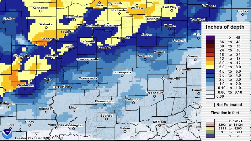 Public Information Statement National Weather Service Indianapolis IN 1220 PM EST Sun Nov 30 2025 ...11/29/2025 CENTRAL INDIANA STORM TOTAL SNOWFALL REPORTS... County Location Snowfall Date/Time Source HOWARD Young America 1 SSE 8.0 in. 11/30 800AM COOP TIPPECANOE Purdue Univeristy 7.8 in.* 11/29 730PM Spotter TIPPECANOE West Lafayette 2 NW 7.0 in.* 11/29 800PM Public CARROLL Burlington 7.0 in. 11/29 1130PM COOP TIPPECANOE West Lafayette 4.2 NW 6.9 in. 11/29 1100PM MRCC Emply TIPPECANOE Lafayette 2.2 NE 6.8 in. 11/30 700AM CoCoRaHS TIPPECANOE Lafayette 2.2 S 6.8 in. 11/30 700AM CoCoRaHS HOWARD Kokomo 4 W 6.5 in. 11/29 1000PM EMA TIPPECANOE West Point 4.0 NW 6.2 in. 11/30 700AM CoCoRaHS HOWARD Russiaville 0.6 WSW 6.0 in. 11/30 700AM MRCC Emply FOUNTAIN Covington 5.5 in. 11/30 700AM CoCoRaHS VERMILLION Perrysville 4 WNW 5.1 in. 11/30 600AM COOP CLINTON Mulberry 1 SSE 5.0 in. 11/30 800AM CoCoRaHS CLAY Fontanet 2 ESE 5.0 in. 11/30 830AM CoCoRaHS --------------------------------------------------------------------- CLINTON Frankfort 0.9 SSE 4.7 in. 11/30 700AM CoCoRaHS CLINTON Kirklin 3.7 W 4.5 in. 11/30 700AM CoCoRaHS HOWARD Center 1.2 NNE 4.2 in. 11/30 700AM CoCoRaHS MONTGOMERY Darlington 4.0 in.* 11/29 850PM Public DELAWARE Muncie 4.0 in.* 11/29 930PM Public VERMILLION Newport 4.0 in. 11/30 700AM CoCoRaHS VIGO Sandcut 2.3 W 4.0 in. 11/30 700AM CoCoRaHS VIGO Terre Haute 2.4 SSW 3.7 in. 11/29 700PM HAM Radio VIGO Sun King Airport 1.5 E 3.5 in. 11/29 643PM Spotter MONTGOMERY New Market 2.6 WNW 3.2 in. 11/30 700AM NWS Emply HENDRICKS Eagle Crk Resrvr 4 NNW 3.1 in. 11/30 700AM CoCoRaHS HAMILTON Fishers 2.5 WSW 3.0 in. 11/29 1100PM NWS Emply MADISON Country Club Hghts 2 N 2.9 in. 11/30 700AM CoCoRaHS BOONE Jamestown 2.8 in.* 11/29 900PM CoCoRaHS OWEN Poland 4 SE 2.8 in. 11/29 854PM Public -------------------------------------------------------------------- HAMILTON McCordsville 3 NE 2.2 in. 11/30 700AM CoCoRaHS HENDRICKS Brownsburg 0.8 NNW 2.1 in. 11/30 700AM NWS Emply HENRY New Castle 3 SW 2.1 in. 11/30 1215AM COOP JOHNSON Franklin 1 W 2.1 in. 11/30 700AM NWS Emply BOONE Lebanon 6 W 2.0 in. 11/30 700AM COOP KNOX Freelandville 2.0 in. 11/30 700AM CoCoRaHS MARION Fountain Square 2.0 in.* 11/29 808PM Public MARION Meridian Hills 2.0 in.* 11/29 600PM CoCoRaHS HANCOCK Fortville 2.0 in.* 11/29 833PM Public MARION Castleton 2 S 2.0 in. 11/29 1159PM COOP MONROE Woodville Hills 1.9 NNW 1.9 in. 11/30 736AM CoCoRaHS PARKE Rockville Fire 1.8 in.* 11/29 530PM COOP BROWN Stone Head 2.3 ENE 1.7 in. 11/30 700AM CoCoRaHS MONROE Bloomington 2 E 1.7 in.* 11/29 923PM Public MARION Indianapolis AP 1 SSE 1.7 in. 11/29 1159PM NWS WFO JOHNSON Greenwood 3.8 W 1.6 in. 11/29 600PM CoCoRaHS OWEN Whitehall 0.7 WSW 1.6 in. 11/30 600AM CoCoRaHS BARTHOLOMEW Flat Rock 1 SSW 1.5 in. 11/30 700AM CoCoRaHS BOONE Zionsville 1.5 in. 11/30 600AM CoCoRaHS MARION Speedway 0.3 W 1.5 in. 11/30 700AM Spotter MONROE Ellettsville 0.5 W 1.5 in. 11/30 700AM CoCoRaHS MORGAN Brooklyn 1.5 in. 11/30 700AM NWS Emply SHELBY Fairland 0.9 SSW 1.5 in. 11/30 700AM CoCoRaHS SULLIVAN Sullivan 1.5 in.* 11/29 830PM Public PUTNAM CLoverdale 3.5 W 1.4 in. 11/30 830AM CoCoRaHS MARION Indianapolis 1.6 N 1.3 in.* 11/29 920PM Media -------------------------------------------------------------------- BARTHOLOMEW Columbus 1.7 N 1.0 in. 11/30 750AM CoCoRaHS CLAY Bowling Green 1 W 1.0 in. 11/30 700AM COOP CLAY Howesville 1.0 in. 11/30 659AM CoCoRaHS GREENE Bloomfield 1.0 in. 11/29 940PM Public LAWRENCE Oolitic Purdue Ex Farm 1.0 in. 11/30 700AM COOP DECATUR Greensburg 6.0 SW 0.8 in. 11/30 700AM CoCoRaHS DAVIESS Elnora 0.6 in.* 11/29 800PM COOP JACKSON Western Jackson County 0.5 in.* 11/29 800PM Public MARTIN Shoals 4.0 E 0.5 in. 11/30 700AM CoCoRaHS DAVIESS Washington 1 W T in. 11/29 600PM COOP *Asterisk indicates accumulating snow was ongoing at time of measurement. Observations are collected from a variety of sources with varying equipment and exposures. We thank all volunteer weather observers for their dedication. Not all data listed are considered official. $$
