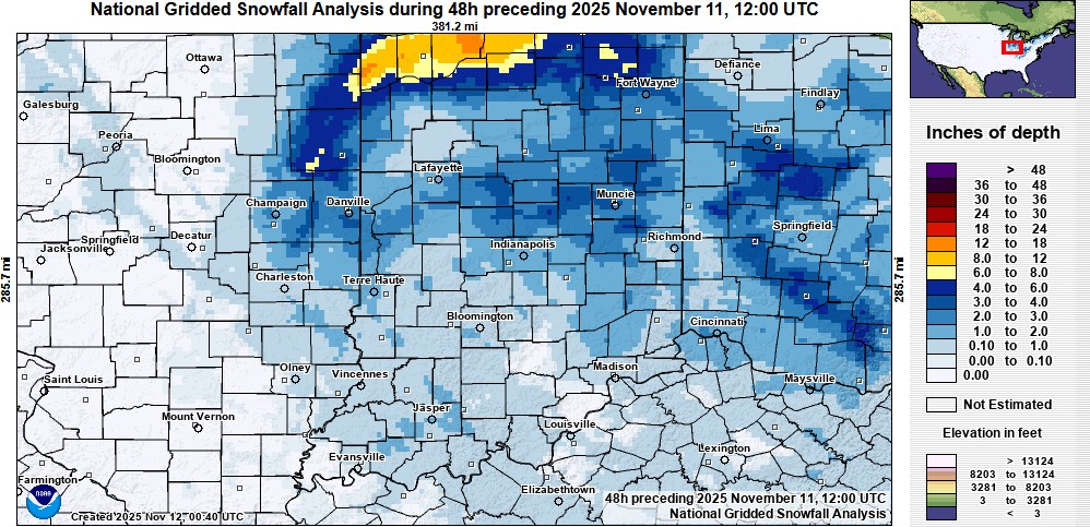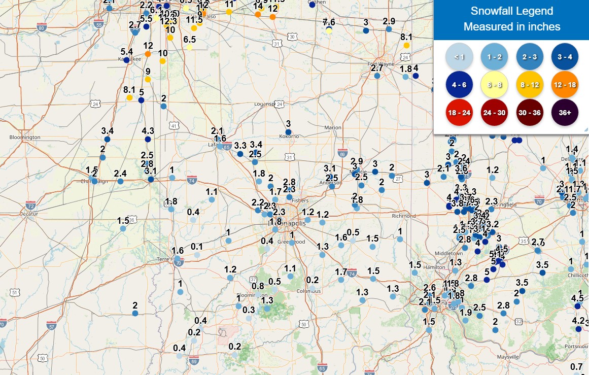 Public Information Statement National Weather Service Indianapolis IN 1233 PM EST Tue Nov 11 2025 ...SNOWFALL REPORTS... Location Amount Time/Date ...Indiana... ...Bartholomew County... Hope 5.2 NW 0.8 in 0800 AM 11/11 Columbus 2 S 0.1 in 0700 AM 11/11 ...Boone County... Lebanon 4.4 W 2.4 in 0700 AM 11/11 Lebanon 6 W 2.4 in 0700 AM 11/11 Zionsville 0.5 NNW 1.9 in 0600 AM 11/11 ...Brown County... (W9DBA)Morgantown 6.7 SSE 1.3 in 0600 AM 11/11 Nashville 3.0 WNW 1.1 in 0900 AM 11/11 Nashville 7.8 SE 0.4 in 0630 AM 11/11 ...Clay County... Clay City 0.4 SE 1.0 in 0900 AM 11/11 ...Clinton County... Frankfort 4.9 NNE 3.9 in 0700 AM 11/11 3 W Kirklin 3.7 in 0700 AM 11/11 Frankfort 0.9 SSE 2.6 in 0700 AM 11/11 ...Daviess County... Plainville 1.3 S 0.5 in 0800 AM 11/11 Elnora 0.1 SW 0.4 in 0800 AM 11/11 Washington 1.5 NW 0.3 in 0700 AM 11/11 Washington 3.3 SE T in 0700 AM 11/11 ...Decatur County... (KB9CIY)Greensburg 6.0 SW 1.7 in 0700 AM 11/11 ...Delaware County... (K9TKO) Springport 3.6 NE 3.0 in 0700 AM 11/11 (K9CJC) Springport 3.5 NE 2.5 in 0700 AM 11/11 Yorktown 1.1 NNW 2.0 in 0700 AM 11/11 (KC9RVL) Yorktown 1.2 NNW 2.0 in 0700 AM 11/11 ...Fountain County... Covington 0.4 WNW 1.0 in 0700 AM 11/11 ...Greene County... Solsberry 4.0 ESE 1.0 in 0700 AM 11/11 Bloomfield 5.3 ESE 0.7 in 0928 AM 11/11 ...Hamilton County... Westfield 1.4 ESE 3.2 in 0745 AM 11/11 Fishers 6.1 E 3.0 in 0700 AM 11/11 Fishers 4.3 ENE 2.5 in 0700 AM 11/11 Carmel 1.5 W 2.5 in 0800 AM 11/11 Noblesville 4.4 ESE 2.4 in 0700 AM 11/11 Carmel 1.4 NNE 2.2 in 0700 AM 11/11 ...Hancock County... Cumberland 0.7 E 1.2 in 0700 AM 11/11 ...Hendricks County... Avon 1.6 N 2.0 in 0700 AM 11/11 Brownsburg 4.6 S 1.7 in 0600 AM 11/11 Avon 1.5 SSE 1.2 in 0900 AM 11/11 Brownsburg 0.8 NNW 1.2 in 0630 AM 11/11 ...Henry County... New Castle 3.2 W 3.6 in 0700 AM 11/11 New Castle 2.4 SW 3.0 in 0700 AM 11/11 ...Howard County... Russiaville 0.6 WSW 2.0 in 0700 AM 11/11 ...Johnson County... Greenwood 2.1 ESE 1.9 in 0730 AM 11/11 Franklin 1 W 1.6 in 0700 AM 11/11 Greenwood 3.8 W 1.3 in 0700 AM 11/11 1.8 SE Franklin 0.8 in 0700 AM 11/11 Greenwood 4.9 SW 0.7 in 0700 AM 11/11 ...Knox County... Wheatland 1.4 SSW 0.4 in 0700 AM 11/11 4.0 NE Vincennes University 0.3 in 0800 AM 11/11 Bicknell 0.5 W 0.3 in 0700 AM 11/11 ...Lawrence County... 1.7 S Avoca 0.9 in 0700 AM 11/11 Bedford 8.6 NNW 0.3 in 0730 AM 11/11 ...Madison County... Anderson 4.0 N 3.1 in 0700 AM 11/11 ...Marion County... Speedway 0.3 W 2.3 in 0830 AM 11/11 Indianapolis 3.2 S 2.1 in 0700 AM 11/11 Speedway 6.2 SSW 1.8 in 0700 AM 11/11 McCordsville 1.7 SW 1.4 in 0700 AM 11/11 Indianapolis 7.8 N 1.2 in 0615 AM 11/11 Indianapolis 5.8 NNE 1.2 in 0800 AM 11/11 ...Martin County... Shoals 4.0 E 1.5 in 0700 AM 11/11 ...Monroe County... Bloomington 1.7 NNW 0.9 in 0700 AM 11/11 Unionville 3.2 NNW 0.8 in 0649 AM 11/11 Bloomington 7.1 E 0.8 in 0800 AM 11/11 Bloomington 2.7 E 0.8 in 0800 AM 11/11 Bloomington 4.3 NW 0.5 in 0700 AM 11/11 Bloomington 6.3 E 0.1 in 0713 AM 11/11 ...Montgomery County... 1.1 NW New Market 1.8 in 0600 AM 11/11 New Market 2.6 WNW 1.4 in 0700 AM 11/11 ...Morgan County... Brooklyn 0.5 ENE 1.2 in 0800 AM 11/11 (N9JPX)Paragon 3.2 ENE 0.3 in 0700 AM 11/11 Mooresville 3.8 NE 0.1 in 0700 AM 11/11 ...Owen County... Spencer 7.0 S 1.2 in 0700 AM 11/11 Spencer 5.7 SE 0.9 in 0800 AM 11/11 Ellettsville 5.8 SW 0.5 in 0600 AM 11/11 ...Parke County... Rockville 3.6 ENE 0.4 in 0700 AM 11/11 ...Putnam County... Greencastle 3.6 ESE 1.0 in 0900 AM 11/11 Cloverdale 3.5 W 0.3 in 0830 AM 11/11 ...Randolph County... Modoc 0.1 W 2.8 in 0700 AM 11/11 (KC9FXU) Winchester 2.2 WSW 2.4 in 0700 AM 11/11 4.6 N Farmland 1.7 in 0800 AM 11/11 ...Rush County... Rushville 0.7 ENE 0.9 in 0600 AM 11/11 Morristown 3.8 ENE 0.8 in 0800 AM 11/11 ...Shelby County... Shelbyville 1.6 SSE 1.3 in 0700 AM 11/11 ...Sullivan County... Hymera 0.4 W 1.0 in 0800 AM 11/11 ...Tippecanoe County... 1 N West Lafayette 2.1 in 0800 AM 11/11 Lafayette 2.2 NE 1.9 in 0700 AM 11/11 Lafayette 0.9 WSW 1.6 in 0800 AM 11/11 Lafayette 2.2 S 1.5 in 0700 AM 11/11 Lafayette 0.5 NNW 1.4 in 0700 AM 11/11 West Lafayette 4.2 NW 1.0 in 0800 AM 11/11 ...Tipton County... Atlanta 4.4 W 2.0 in 0530 AM 11/11 5.1 SE Goldsmith 2.0 in 0530 AM 11/11 ...Vermillion County... 0.7 SW Gessie 3.7 in 0600 AM 11/11 Newport 0.4 WSW 1.8 in 0700 AM 11/11 ...Vigo County... Terre Haute 6.5 N 1.8 in 0830 AM 11/11 Terre Haute 2.4 E 1.6 in 0800 AM 11/11 Terre Haute 2.4 ESE 1.6 in 0800 AM 11/11 ...Warren County... 0.9 SW Pence 1.5 in 0700 AM 11/11 Observations are collected from a variety of sources with varying equipment and exposures. We thank all volunteer weather observers for their dedication. Not all data listed are considered official.