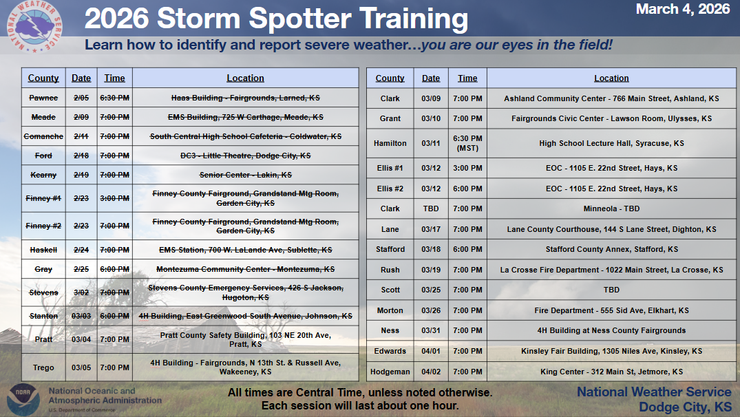 The National Weather Service in Dodge City provides storm identification/spotter training sessions each spring. These sessions are done in cooperation with county Emergency Management agencies across the area. All training is free and is open for anyone to attend and is not designed for just storm spotters. Anyone with a desire to learn how to identify severe weather and to learn about the dangers from these storms is encouraged to attend. The program lasts around 1 hour.
