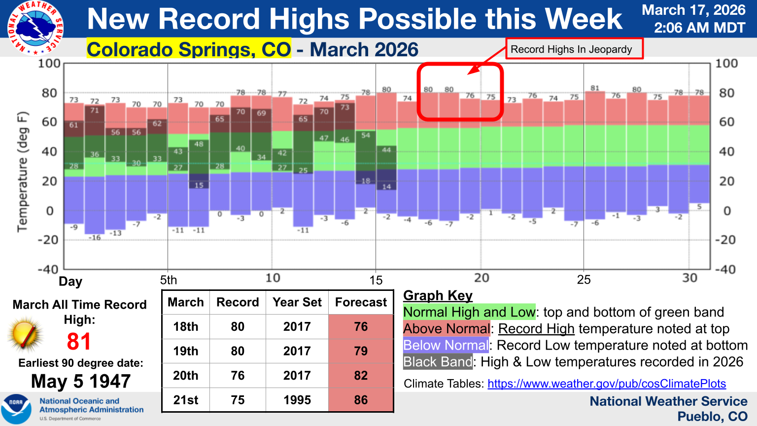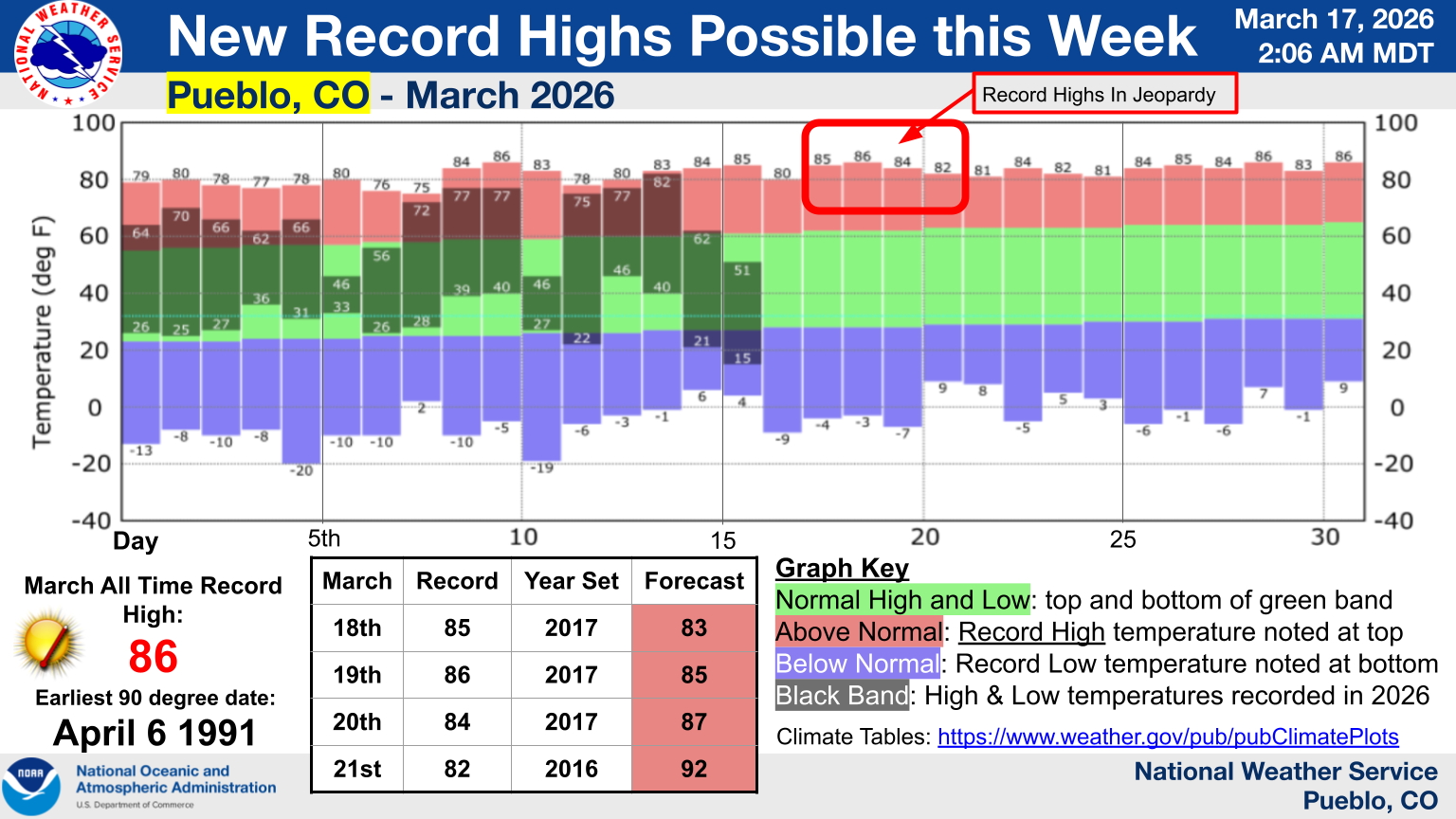 Record high temperatures are in jeopardy of being broken from Wednesday through Saturday (March 18th - 21st). Forecast high temperatures in that period have a good chance of breaking the all time record high temperature for the month of March as well. Here are some statistics for our 3 primary climate sites: Pueblo, Colorado Springs and Alamosa.