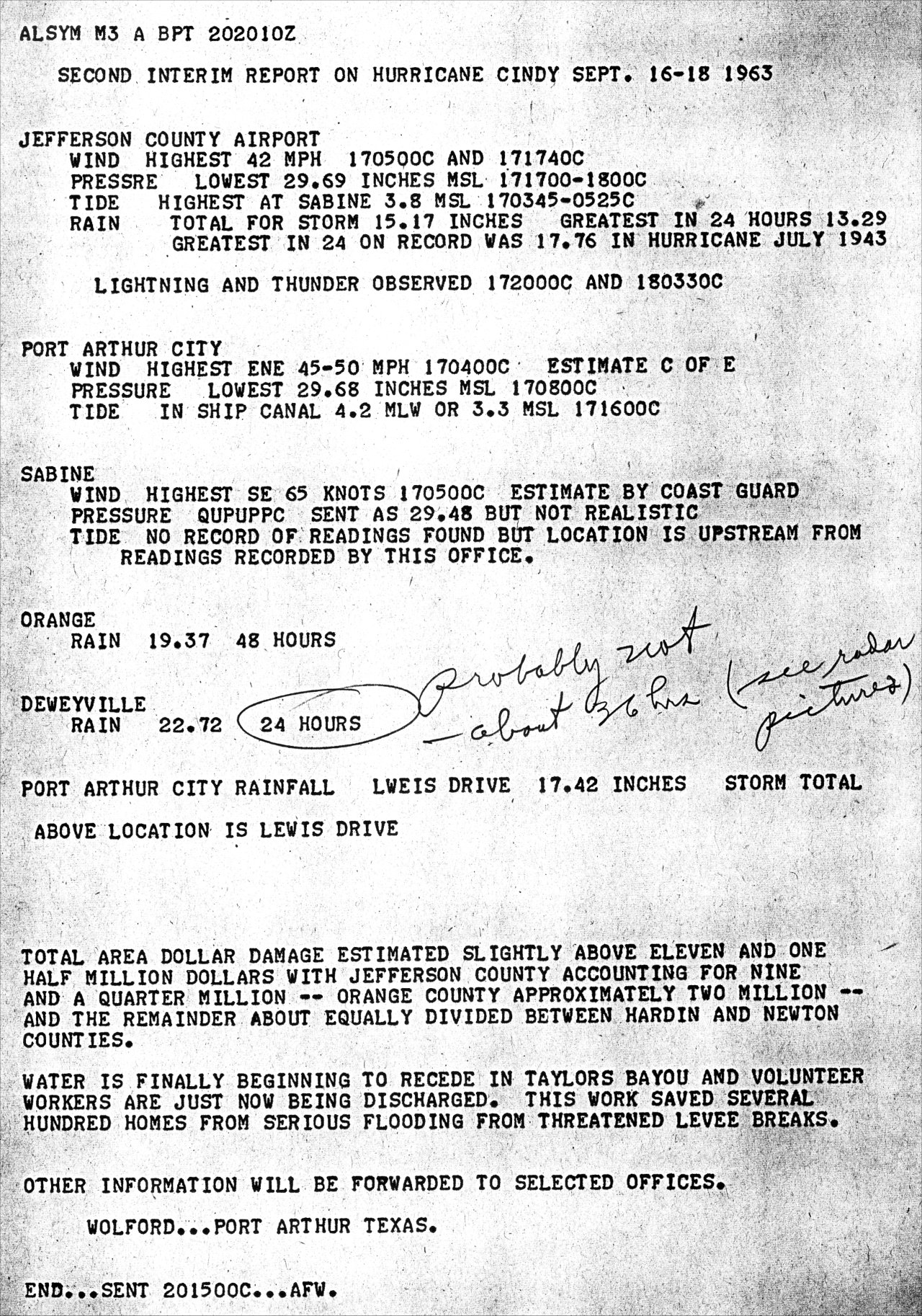 Cindy was originally designated a minimal hurricane at 75 mph (65 knots) just before and at landfall per the original post storm reports. This storm was investigated by the ongoing Hurricane Re-Analysis Project of the Hurricane Research Division, could not find any observations of sustained hurricane force winds from ships or aircraft reconnaissance data. Thus, Cindy was downgraded to a tropical storm during the period from September 16th to the time of landfall on September 17th.