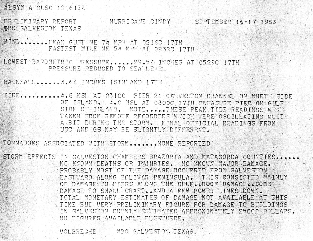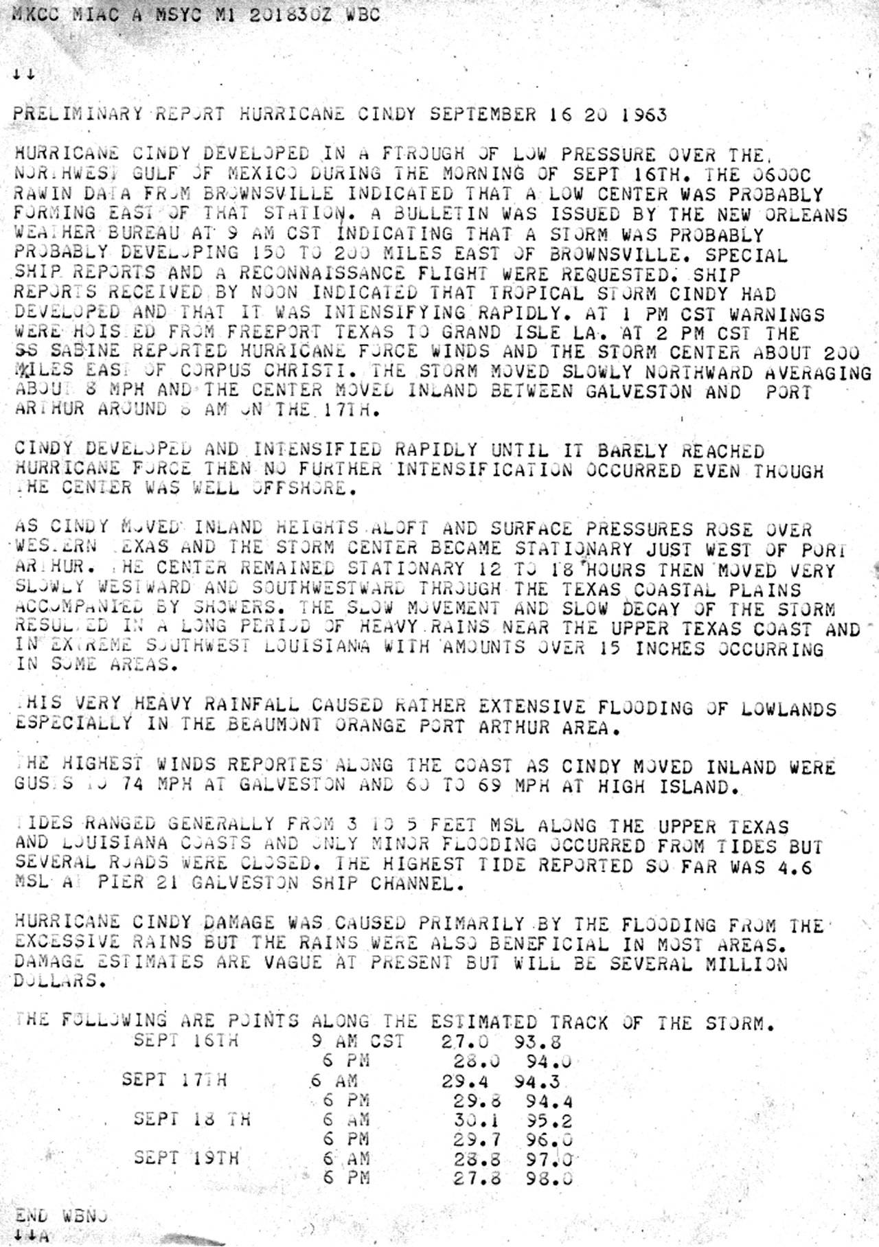 Tropical Storm Cindy developed rather quickly around daybreak on September 16th from an old frontal trough across the Northwest Gulf about 150 miles south of the Upper Texas coast. High pressure at the surface and aloft over the Eastern Gulf allowed the storm to move northward and intensify, reaching a peak intensity of 65 mph (55 knots) later that evening.