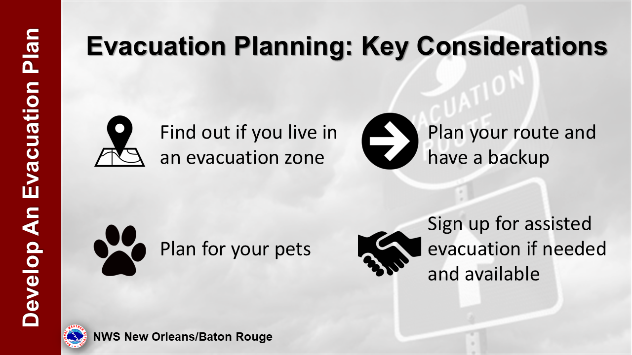 Now is the time to learn what evacuation routes you would use, the location you would go, and what you would bring with you if you evacuated. If you live in a safe location away from storm surge flooding and decide to stay, you should have provisions of food and water to last from several days to a week or more without normal service.