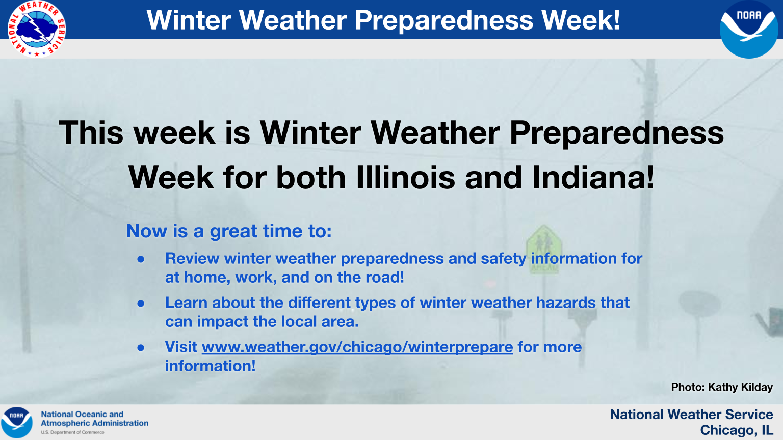 Winter Weather Preparedness Take some time to review winter weather preparedness and safety information as well as learn about the different winter weather hazards that can impact northern Illinois and northwest Indiana! |
