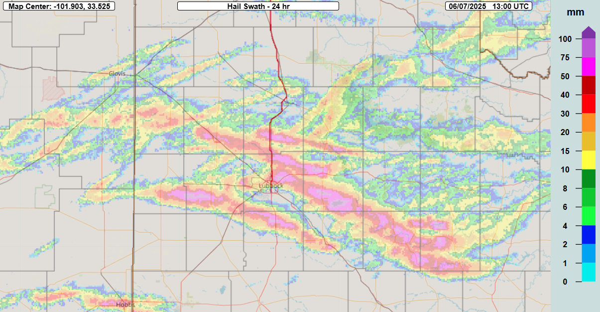 Multi-Radar Multi-Sensor (MRMS) 24-hr hail swath (mm) ending at 8 am on Saturday (7 June 2025). | |