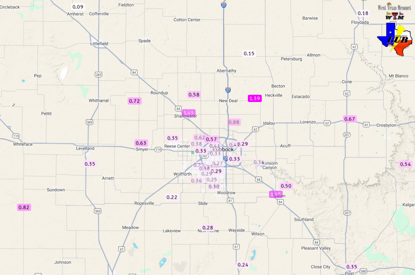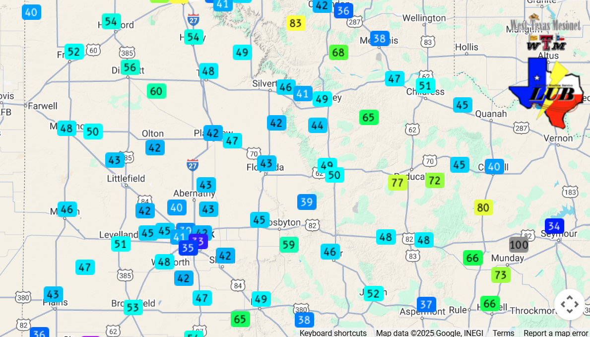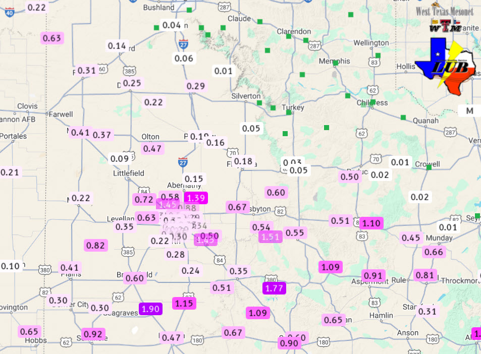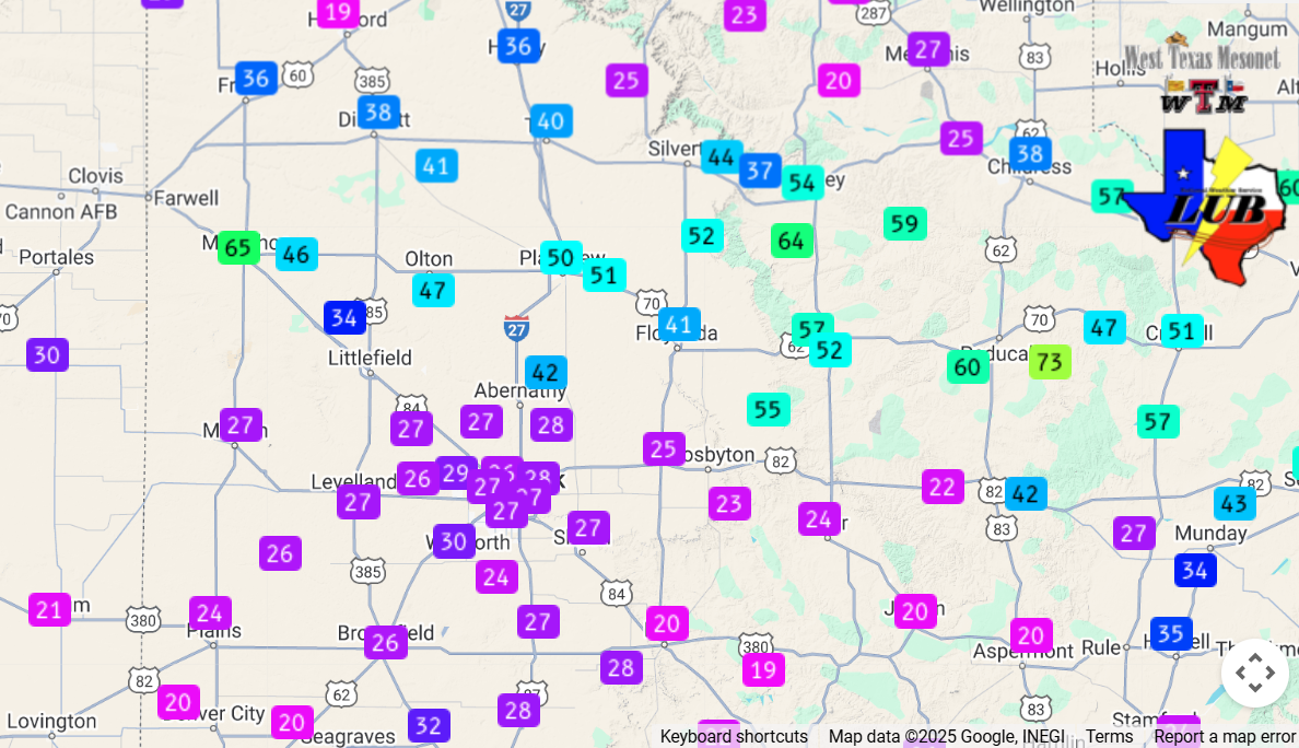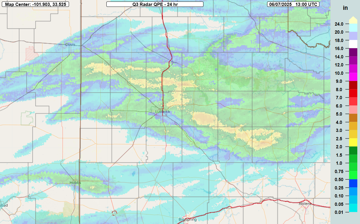 24-hour rainfall measured by the West Texas Mesonet (WTM), ending at 7 am on Tuesday (10 June 2025). A closeup of the Lubbock area can be ACCESSED HERE. | |