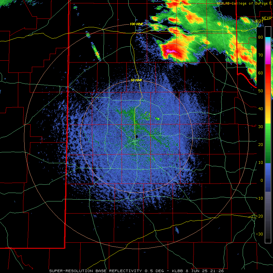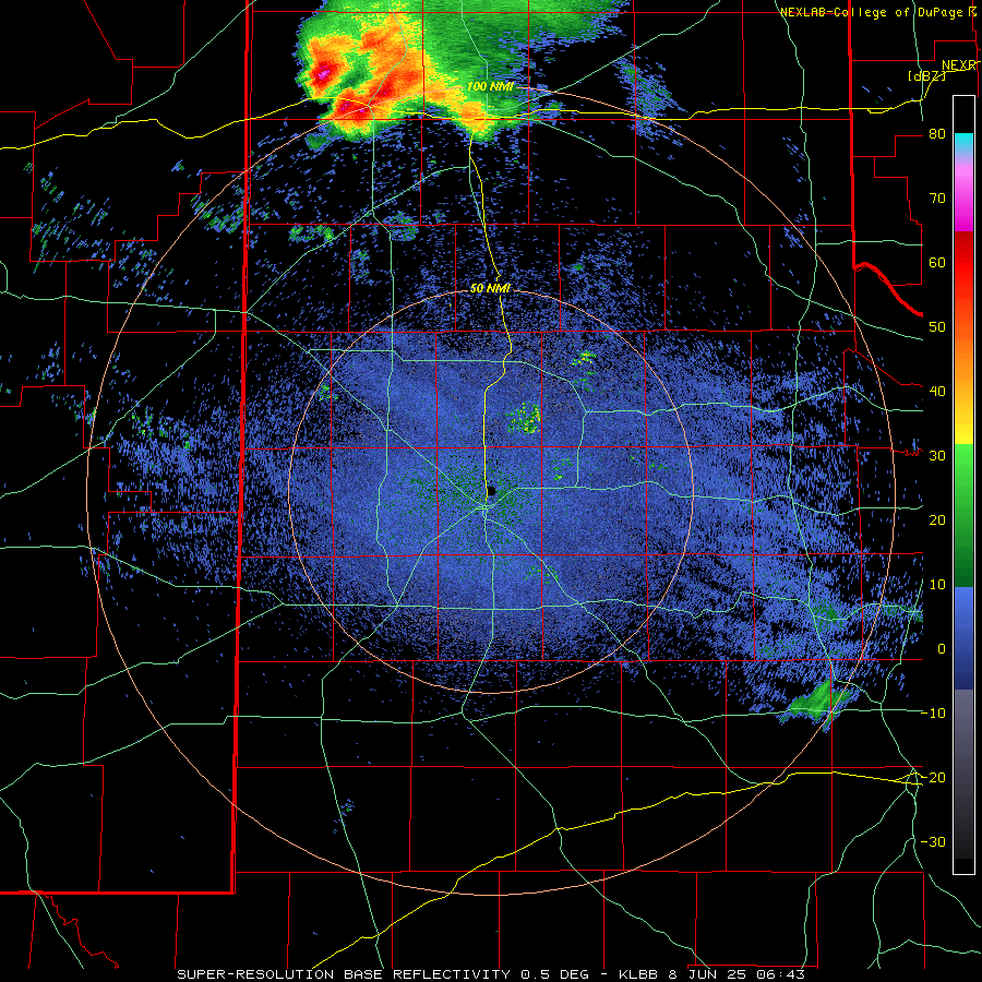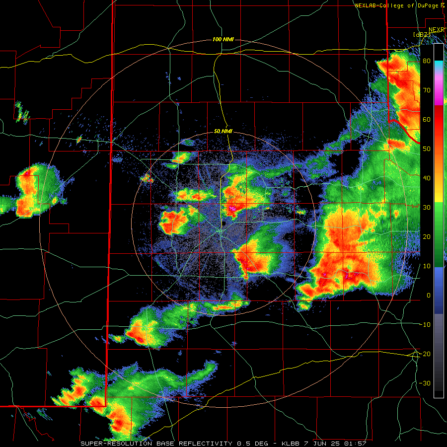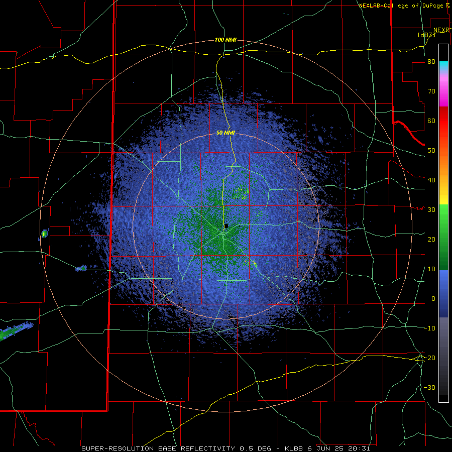 LBB WSR-88D radar animation valid from 4:30 pm to 9:56 pm on Sunday (8 June 2025). An additional radar animation, valid from 1:43 am to 6:18 am on Sunday, can be VIEWED HERE. A regional radar animation, valid from 1:05 pm on Sunday to 6:15 am on Monday (8-9 June), can be FOUND HERE. A visible satellite animation, valid from 3:01 pm to 8:11 pm on Sunday, can be VIEWED HERE. | |