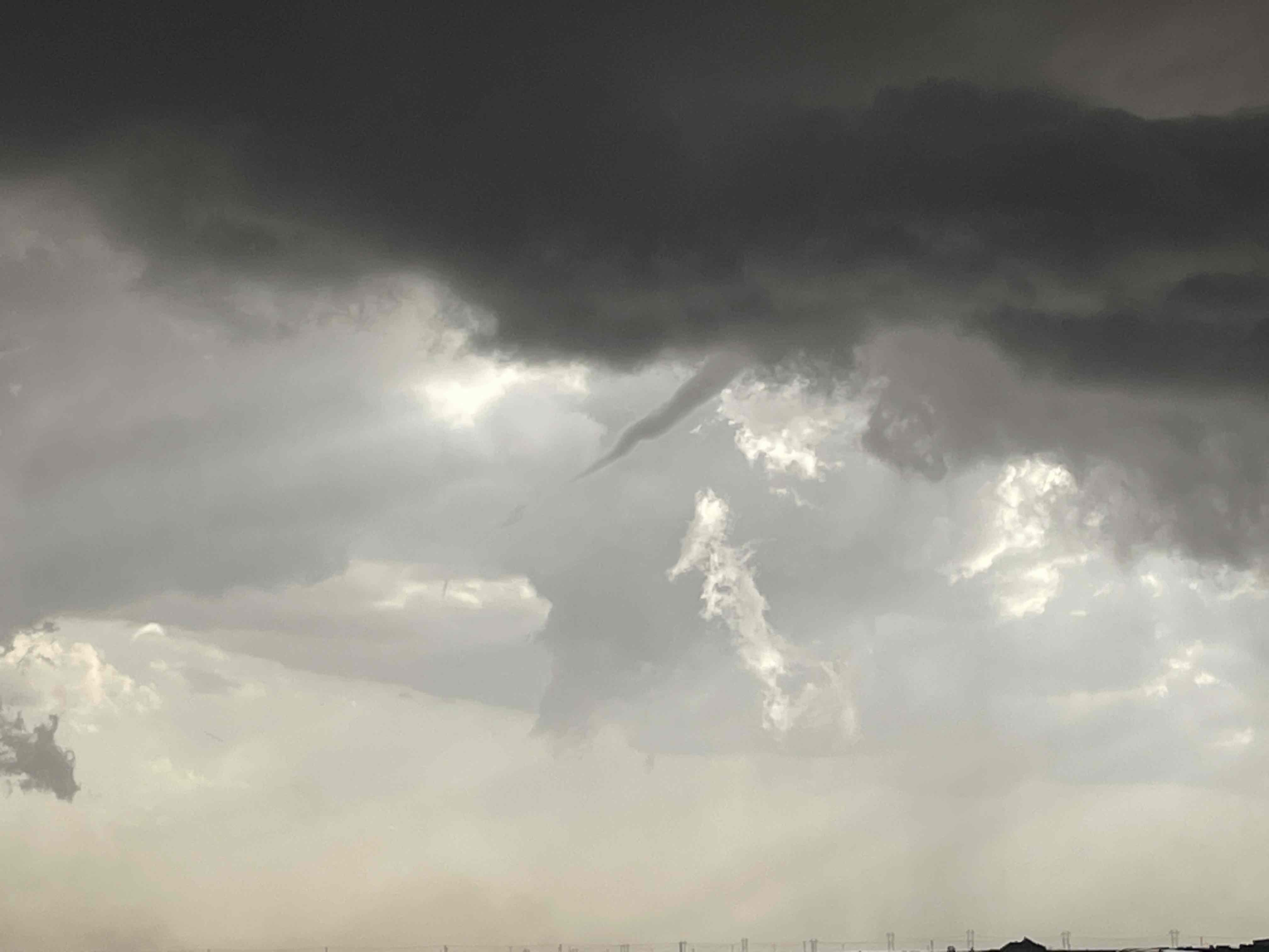 (left) Supercell thunderstorm viewed from east of New Deal Friday evening (6 June 2025) around 8 pm. The image is courtesy of Timothy Silwinski. (right) Funnel cloud associated with a thunderstorm looking to the west-southwest of Ropes at 7:34 pm on Friday. The image is courtesy of Lyle Jones. | |