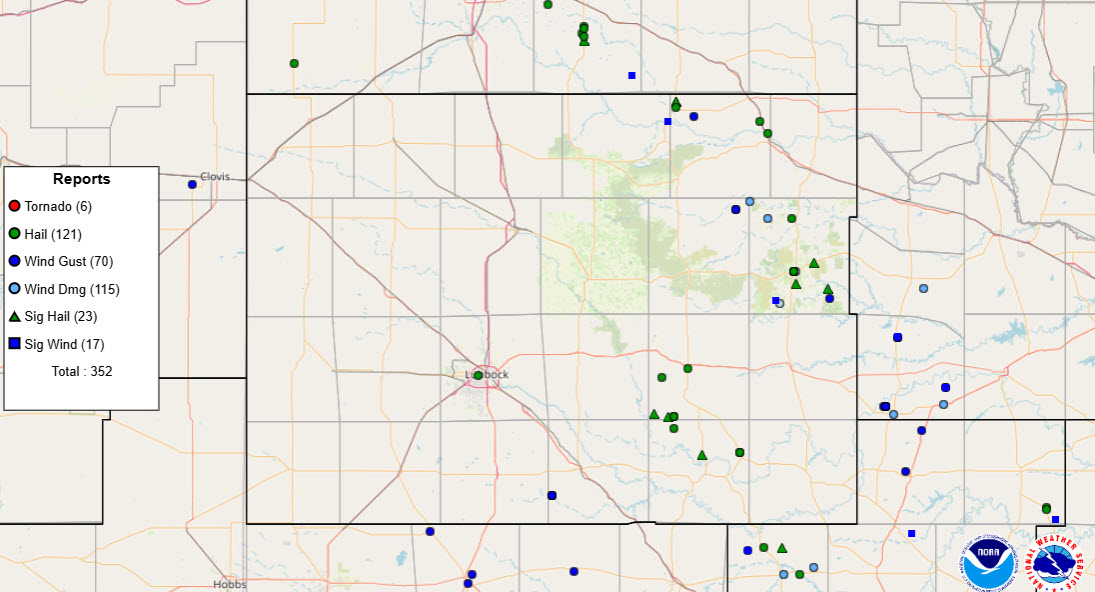 The bulk of the severe weather on Sunday targeted locations off the Caprock, as the below graphic shows. | |