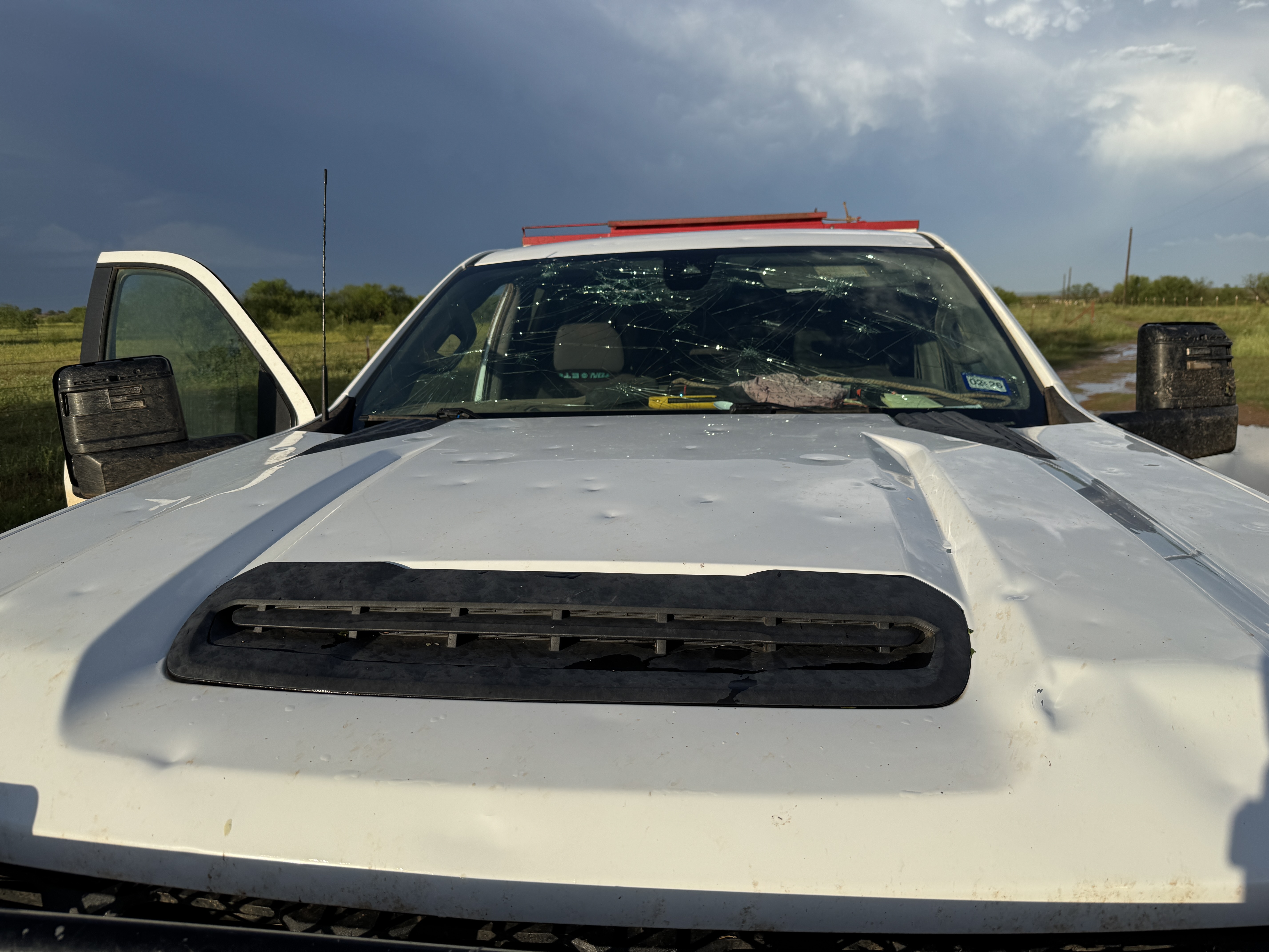 The intense winds were even more damaging when coupled with large hail. Wind-driven golf ball size hail caused significant property damage to vehicles and structures, as seen in the pictures below from east of Paducah. | |