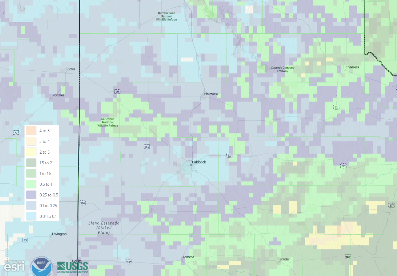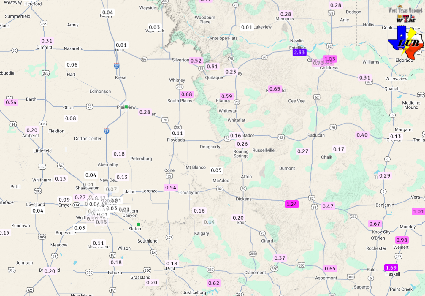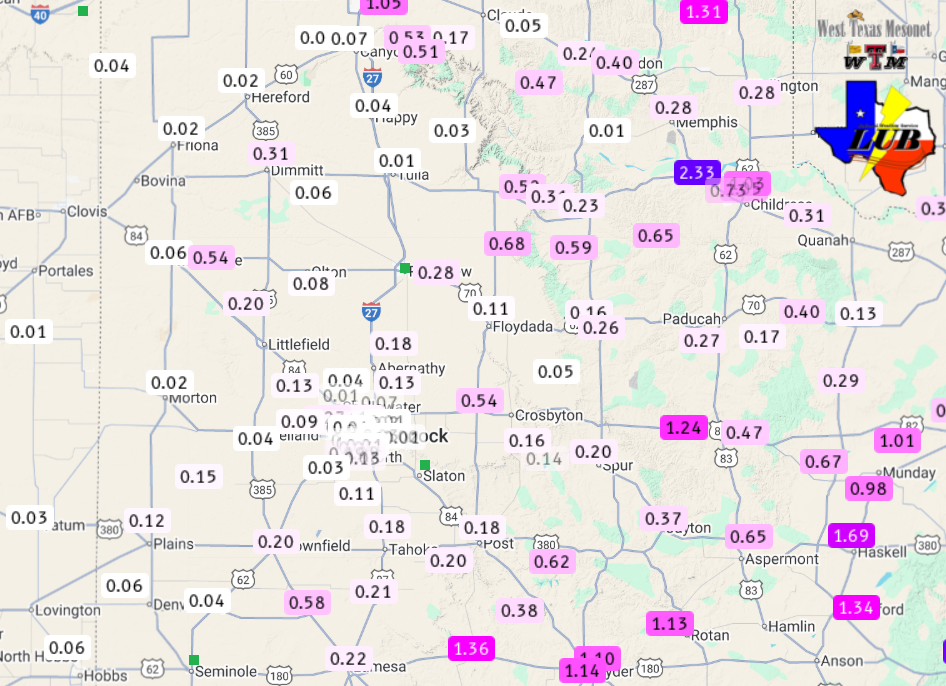 | The south-central Texas Panhandle and central and southwestern South Plains largely missed out on the meaningful rain, with many locations only tallying a few hundredths to a tenth of an inch of rain. Officially, the Lubbock airport measured 0.10 inches over the 3-day stretch, with even less seen over much of the city. | |