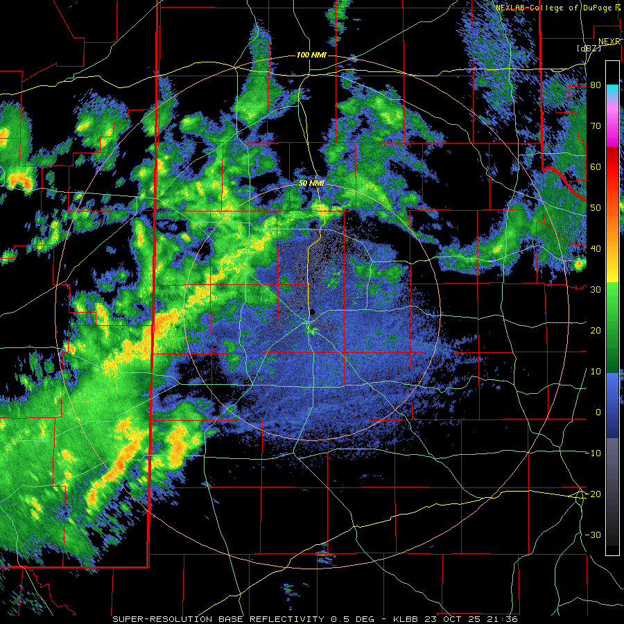 Lubbock WSR-88D radar animation valid from 4:36 pm to 9:57 pm on Thursday (23 October 2025). |