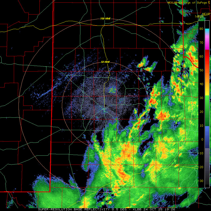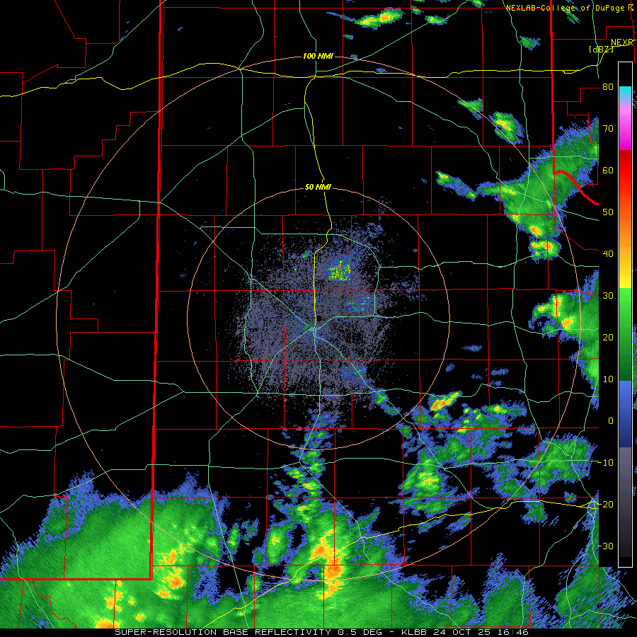 | Lubbock WSR-88D radar animation valid from 2:26 pm to 4:40 pm on Friday (24 October 2025). An additional radar animation, valid from 11:46 am to 1:58 pm on Friday, can be VIEWED HERE. | |