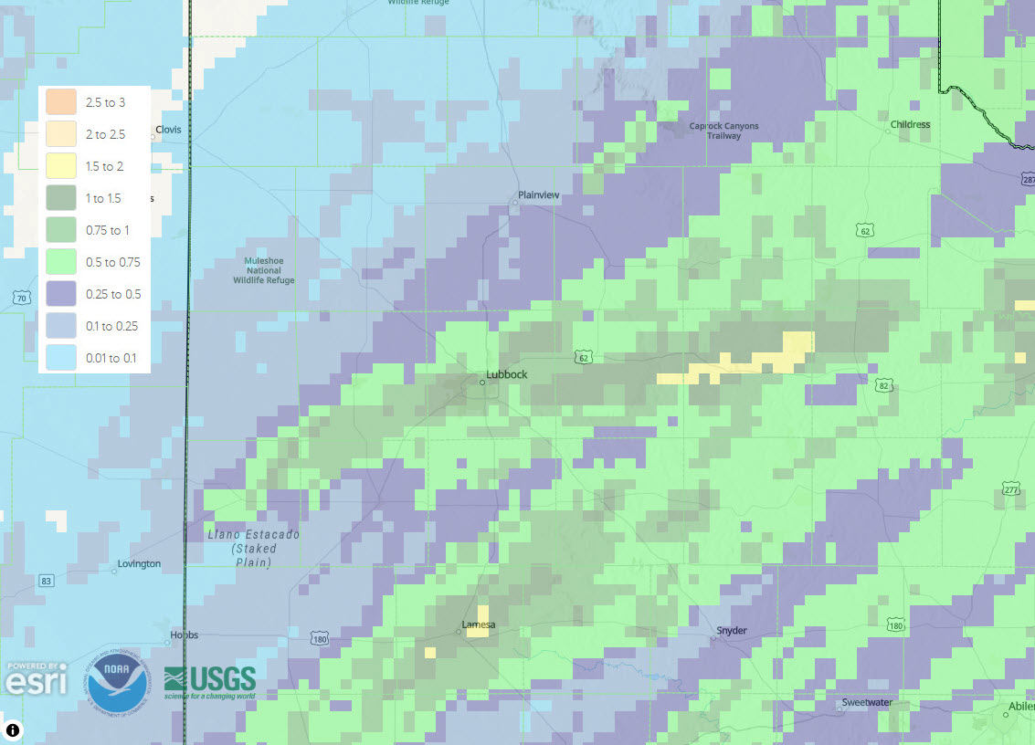 | In addition to producing heavy rain, the intense thunderstorm generated a peak wind gust of 65 mph at the West Texas Mesonet site on the northeast side of Slaton. The preliminary storm report collected by WFO Lubbock for this event can be found below. |