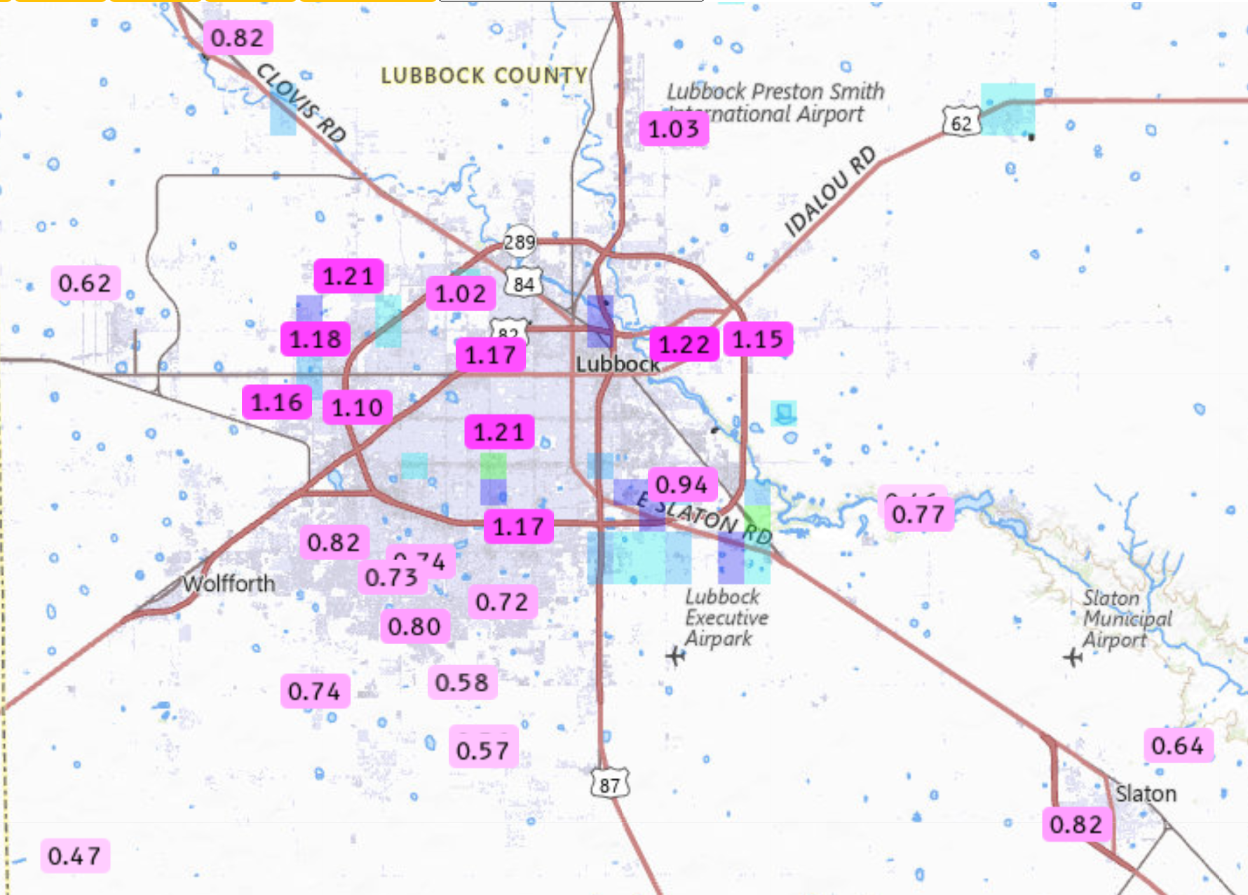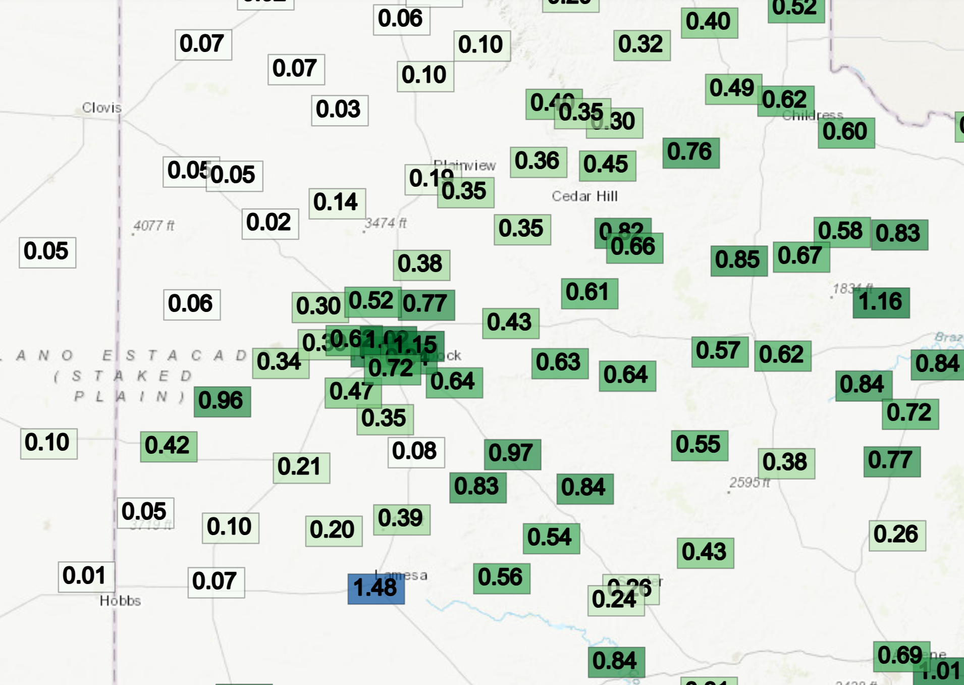 Some of the heaviest rain targeted Lubbock, with many sites around town measuring between 0.70 and 1.25 inches of rain, much of which fell in about a half hour. The torrential rain caused widespread street flooding as runoff quickly filled the roadways. Officially, the Lubbock Airport measured 0.93 inches Friday evening into early Saturday, more than doubling the year-to-date rain total to 1.59 inches. |