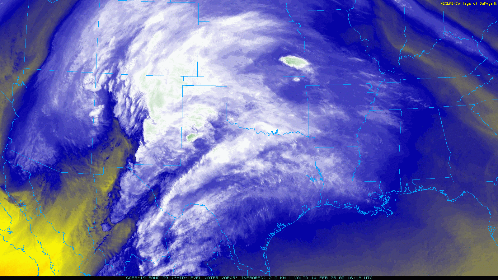 | Water vapor satellite animation valid from 6:16 pm to 7:21 pm on Friday (13 February 2026). | |