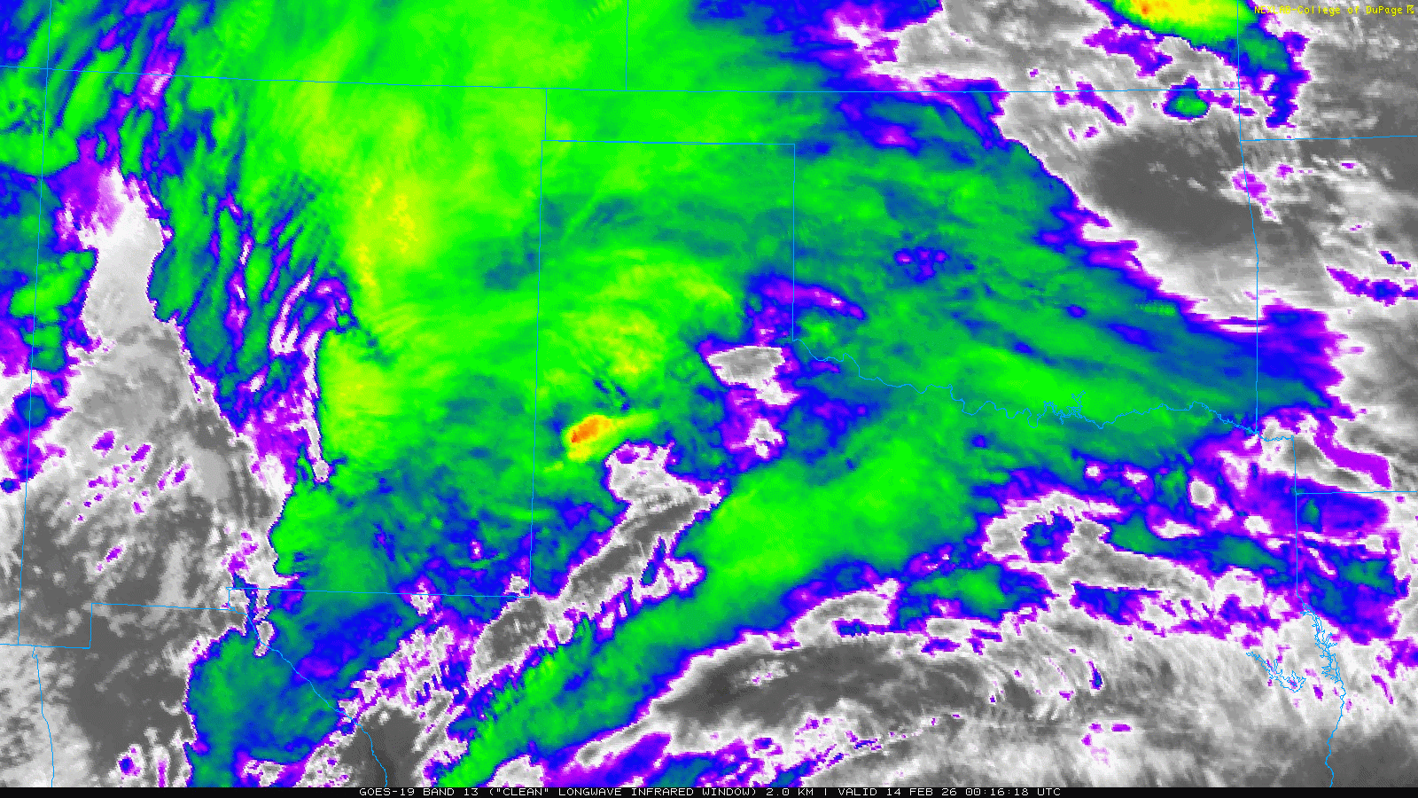 | Infrared satellite animation valid from 6:16 pm to 7:21 pm on Friday (13 February 2026). | |