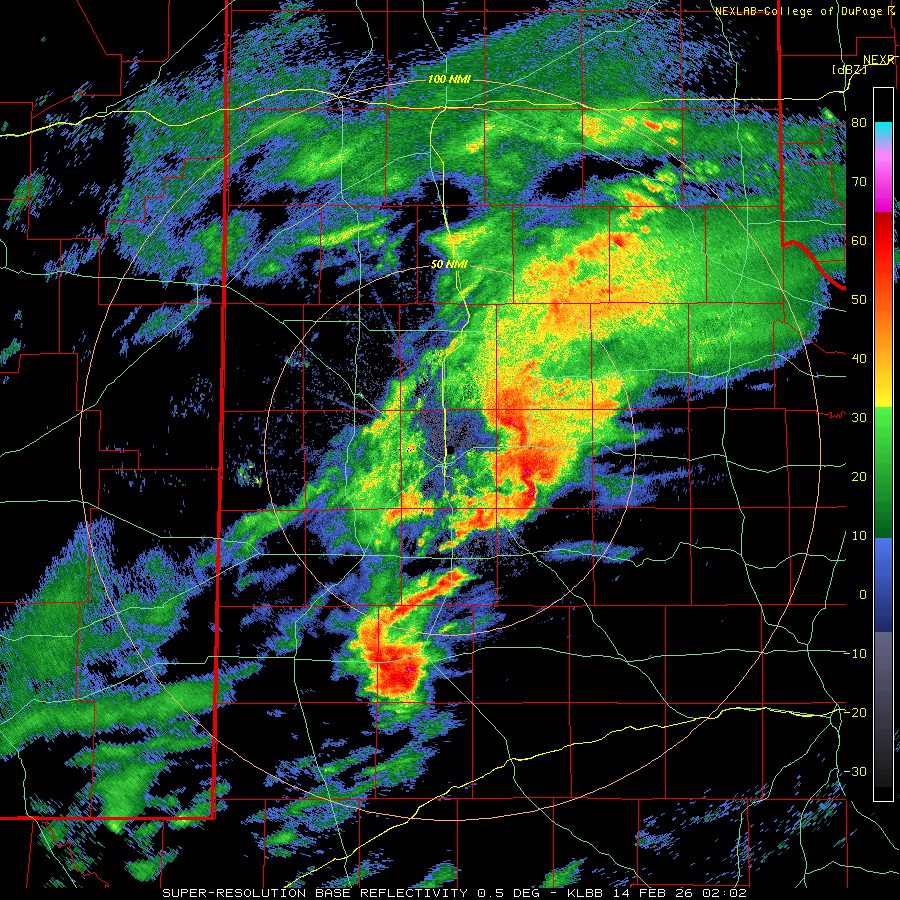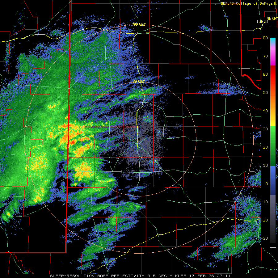 | Lubbock WSR-88D radar animation valid from 5:11 pm to 9:54 pm on Friday (13 February 2026). An additional radar animation, valid from 8:02 pm on Friday to 10:18 am on Saturday (13-14 February), can be FOUND HERE. A regional radar animation, valid from 4:05 pm on Friday to 10:05 am on Saturday, can be VIEWED HERE. | |