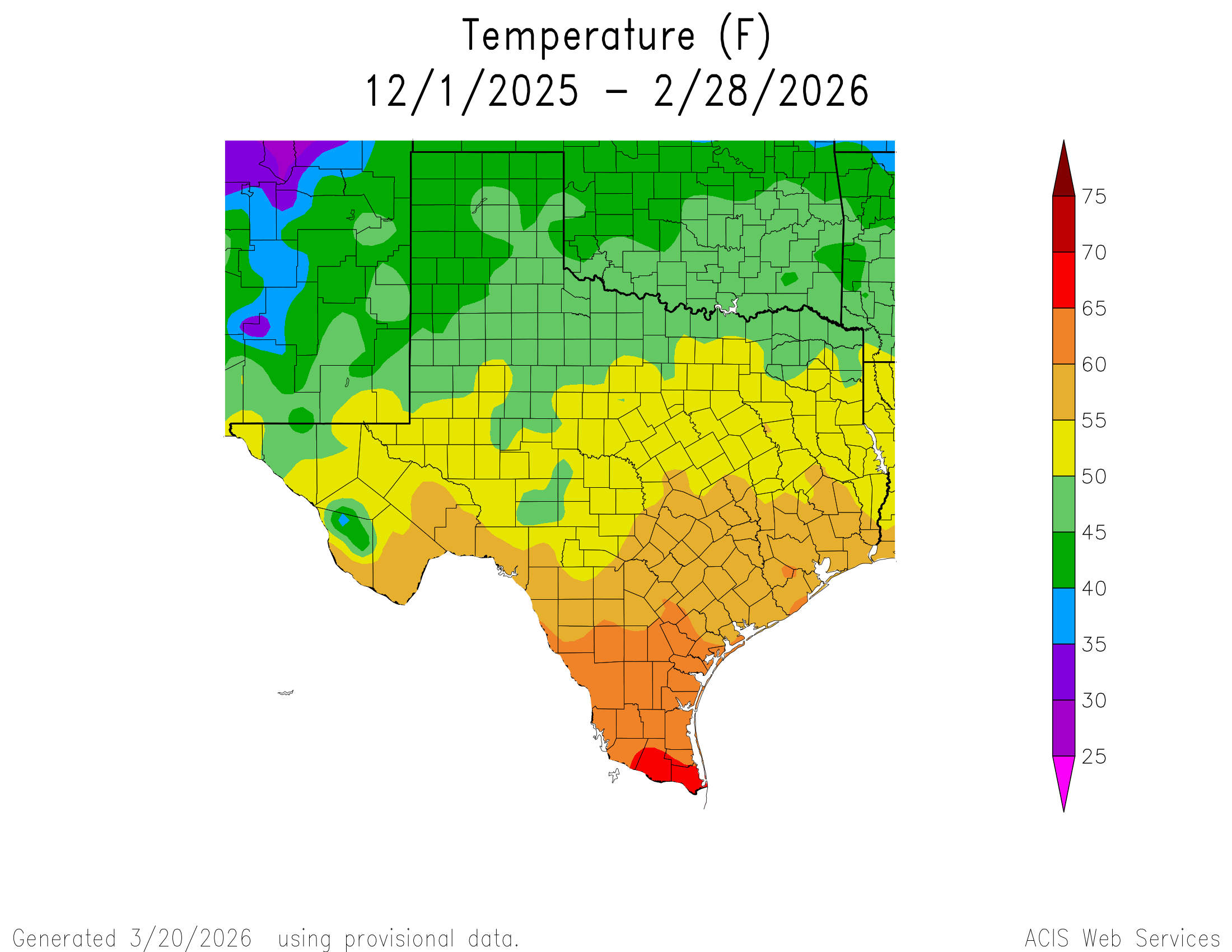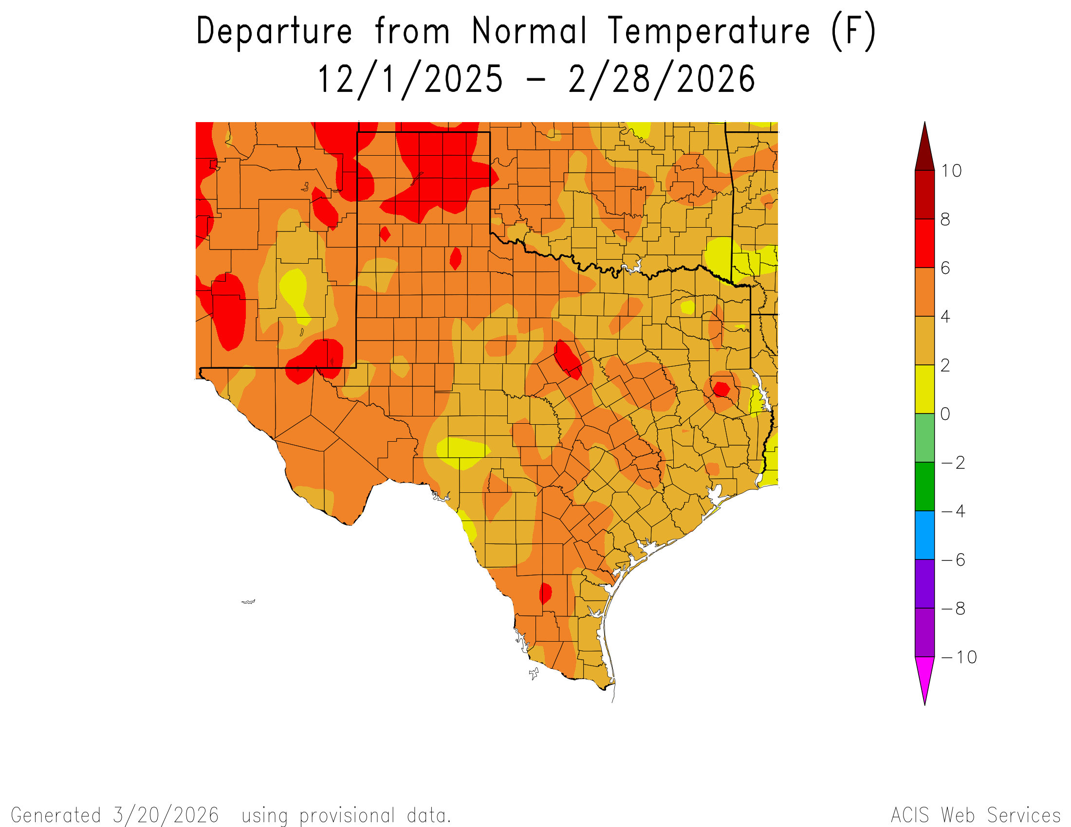 | 2025-2026 winter average temperature departure from normal for Texas. The average temperature for Texas over the entire winter can be FOUND HERE. | |