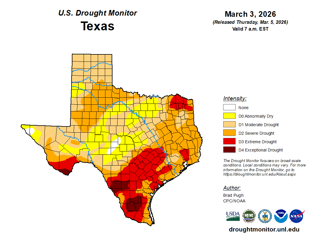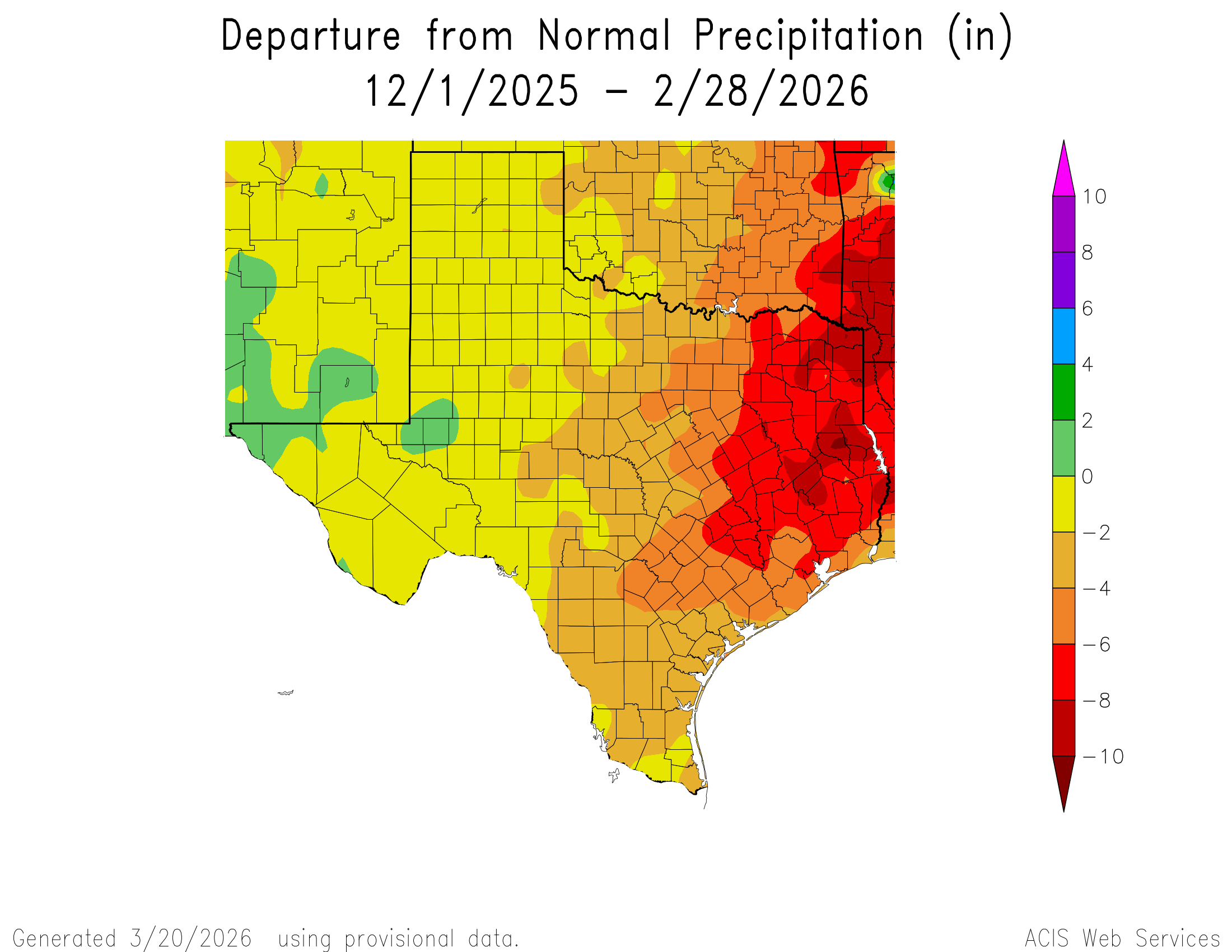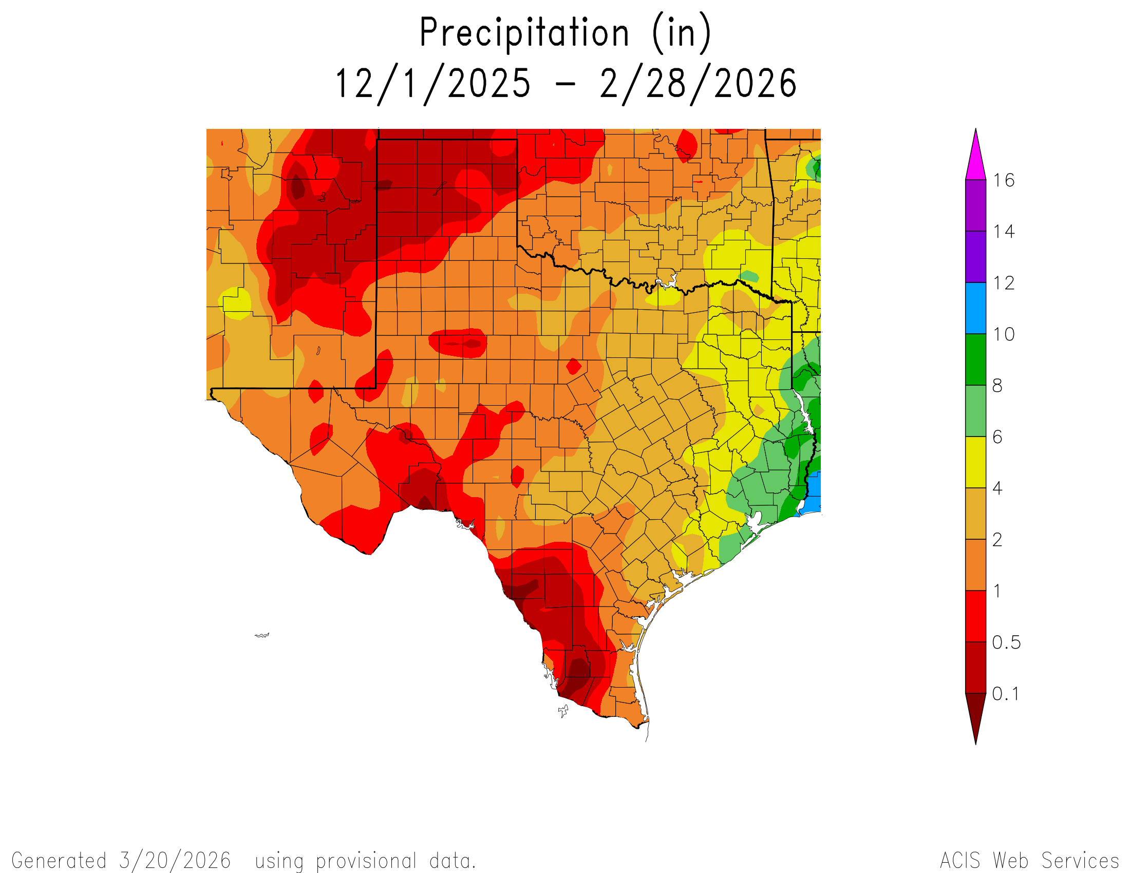 As is often the case, the warmth was paired with relatively dry conditions. Aside from the wintry weather during the brief Arctic intrusion in late January, widespread rain on February 13th, and spotty severe thunderstorms on March 5th, dry conditions dominated the 2025-2026 winter. The entire South Plains, Rolling Plains and southern Texas Panhandle finished the winter with below average precipitation. The dry conditions were exacerbated by the record warmth and resulted in expanding and intensifying drought through the winter. |