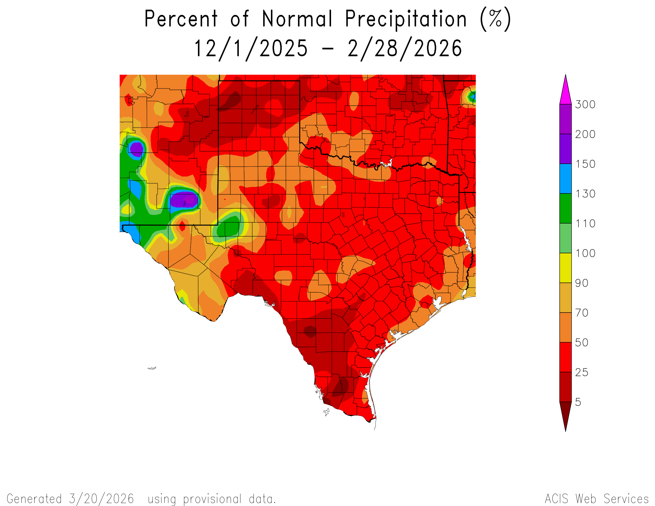 | 2025-2026 winter percent of normal precipitation for Texas. The winter precipitation totals for Texas can be VIEWED HERE and the departure from normal precipitation can be OBTAINED HERE. | |