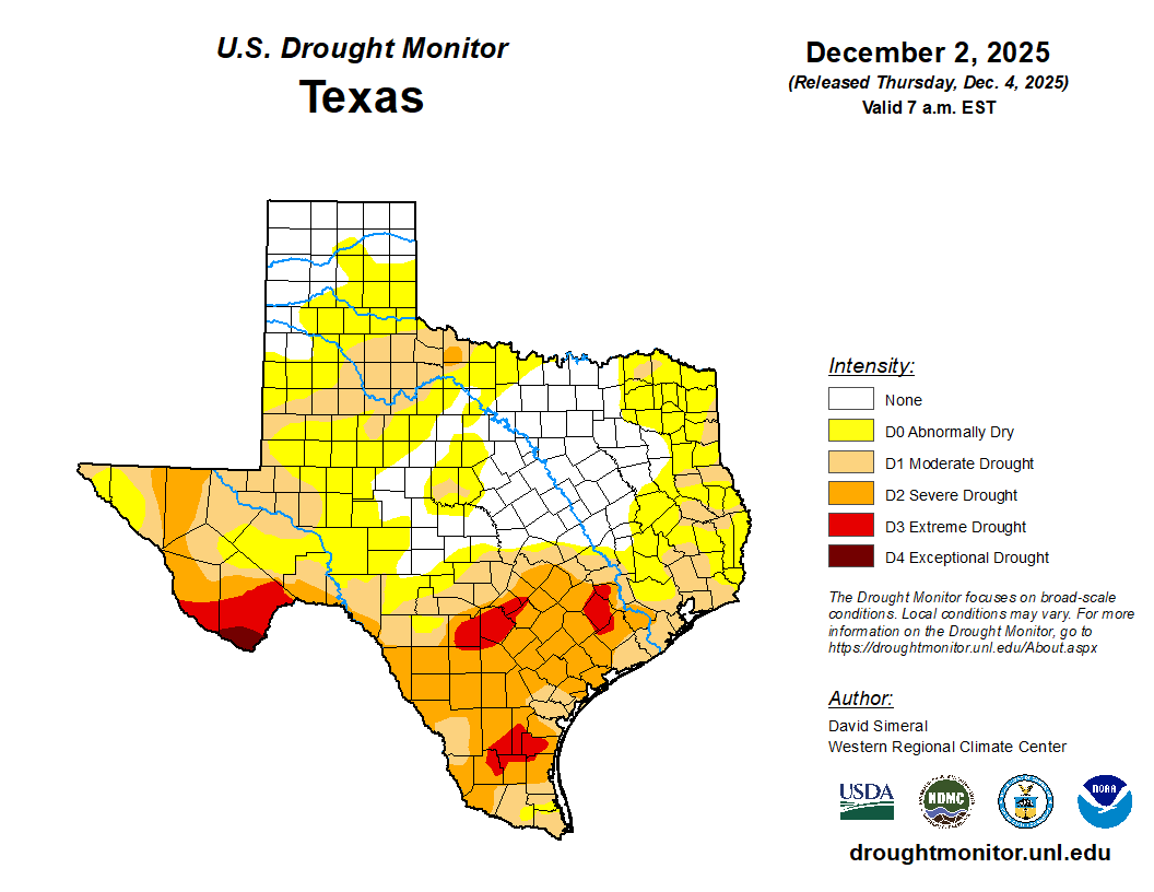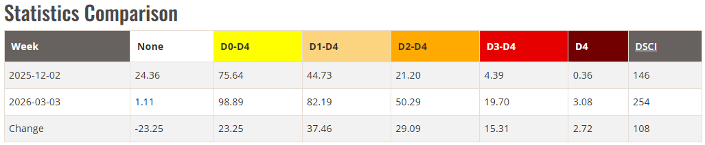 | (top left) Drought monitor valid on December 2, 2025. (top right) Drought monitor valid on March 3, 2026. (bottom) Stats comparison between the drought conditions in early December 2025 and early March 2026. | |