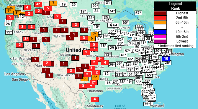 | Map showing the 2025-2026 winter temperature rankings at observation sites across the nation. | |