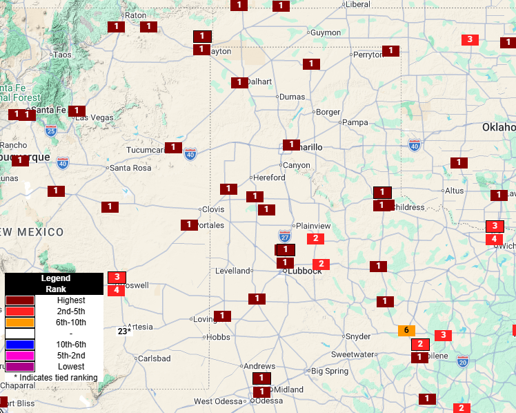 Looking into the details, much of the region experienced average winter temperatures 4 to 6+ degrees above the long term average. Officially, Lubbock's average temperature was 48.5˚F, and astounding 2.8˚F above the previous record of 45.7˚F, set in 2017. The warm winter was punctuated by an extraordinary warm period around Christmas where Lubbock exceeded the previous all-time December high temperature of 83 degrees on 4 out of 6 days, including a high of 86˚F on Christmas Day! The record warmth wasn't just at Lubbock, it included all four corners of our service area, including Friona, Denver City, Childress and Aspermont. |