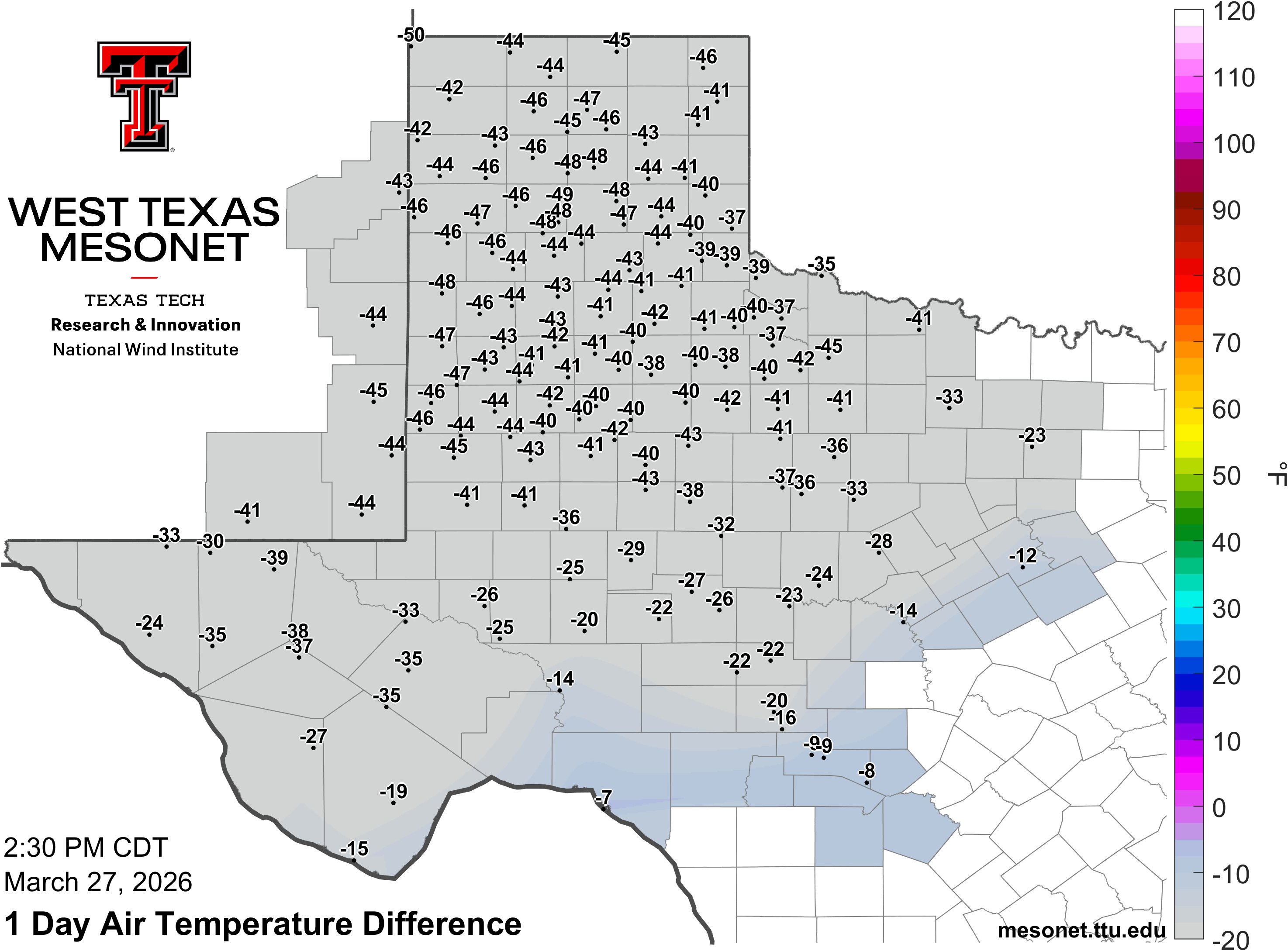 | 24-hour temperature difference valid at 2:30 pm on Friday (27 March 2026). The graphic and data are courtesy of the West Texas Mesonet (WTM). | |
