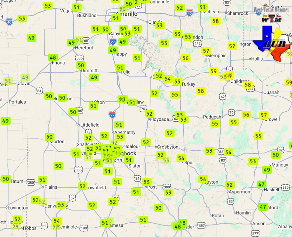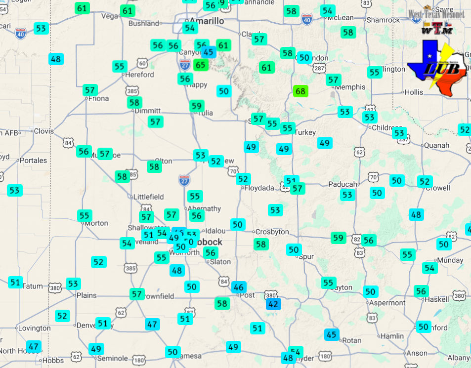 The northerly winds carried in much colder air, which was enhanced by thick and persistent cloud cover that filled in behind the front and lasted all afternoon and evening. The cool down felt even more dramatic coming on the heels of record heat the previous day when temperatures soared well into the 90s. Many locations across the western South Plains into the southern Texas Panhandle even briefly breached the triple digits! Behind the front, temperatures were stuck in the 40s much of the day Friday, though did edge into the lower and middle 50s late in the day. |