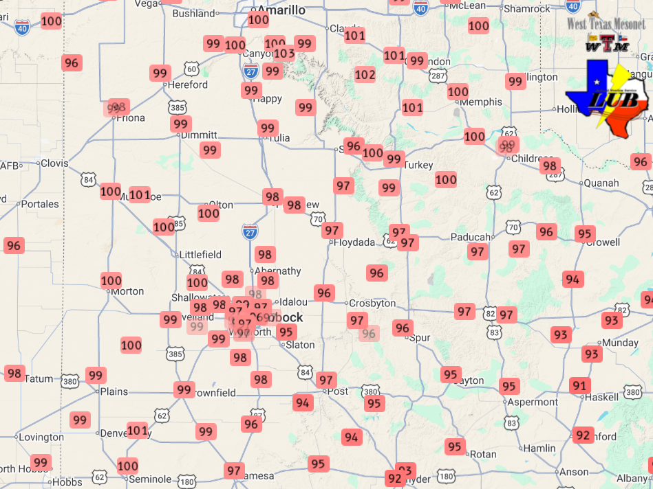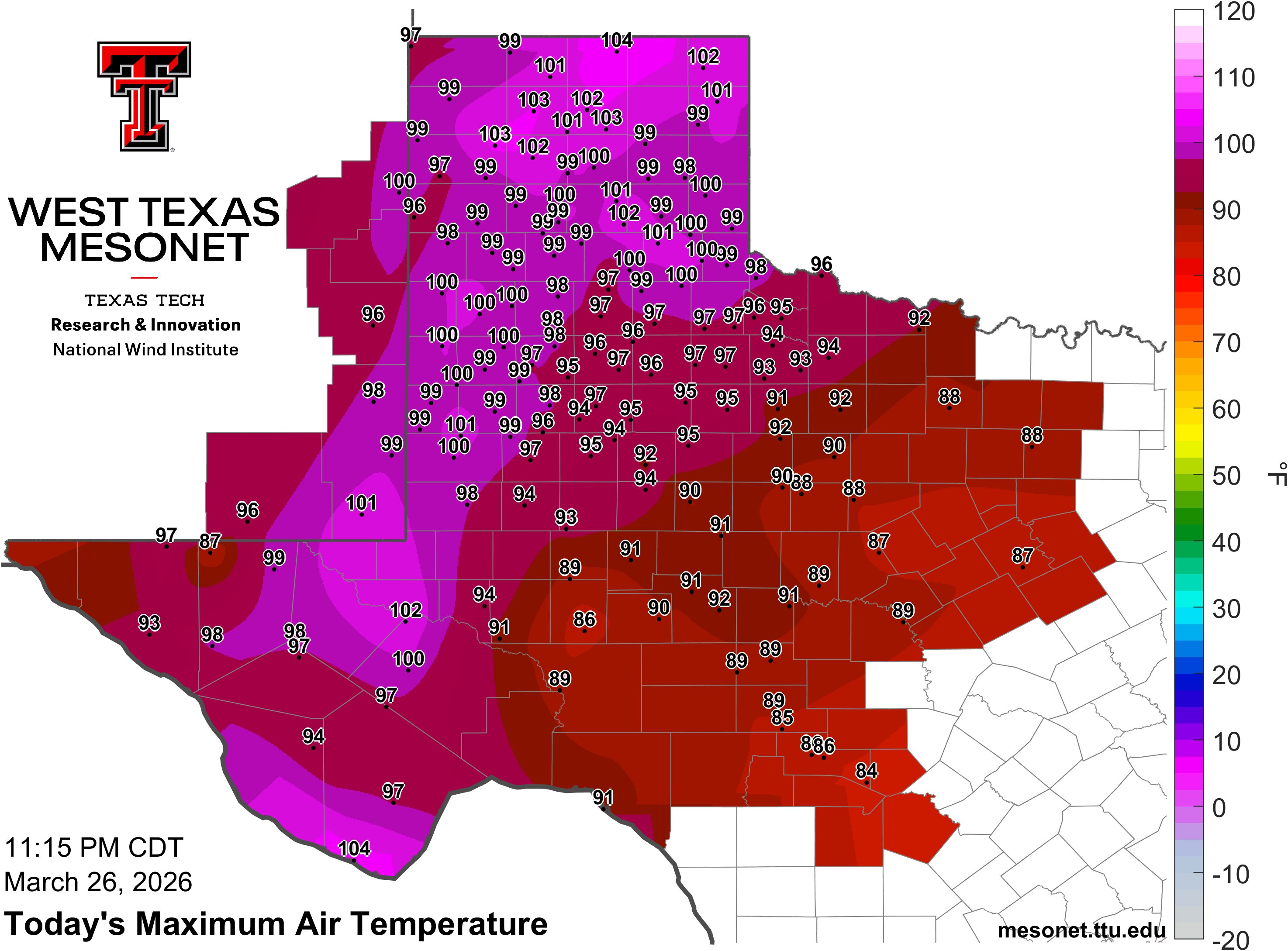 | (Left) High temperatures observed on Thursday (26 March 2026). The graphic and data are courtesy of the West Texas Mesonet (WTM). A close up view of the South Plains region can be FOUND HERE. (Right) Temperatures measured by the WTM at 3 pm on Friday (27 March 2026). | |