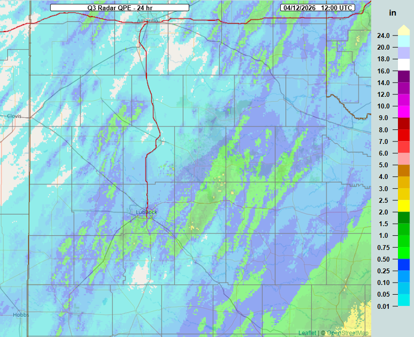 | 24-hour rainfall around Lubbock, valid through 9:45 am on Sunday (12 April 2026). The data are courtesy of the National Weather Service (NWS) and West Texas Mesonet (WTM). A South Plains-wide perspective can be FOUND HERE. | |