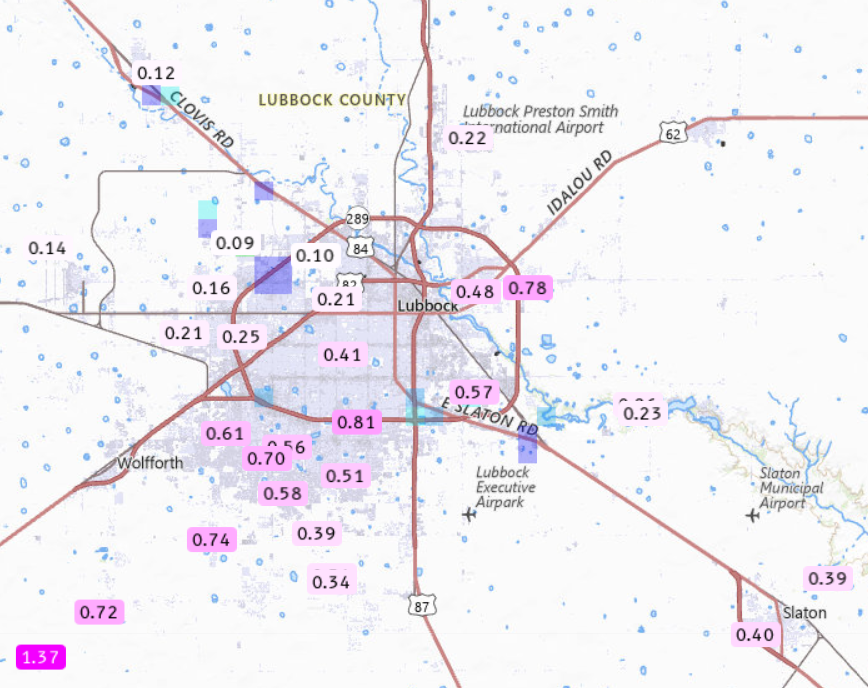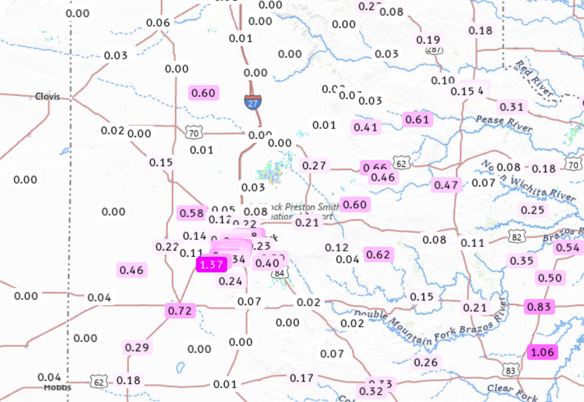 | Overall, the southeast two-thirds of the city of Lubbock was relatively lucky, receiving a quarter to over three-quarters of an inch of rain. Unfortunately, not everyone saw meaningful rain, with parts of the southern, northwestern and north-central South Plains getting little to none. Officially, the Lubbock Airport was on the lighter side, only measuring 0.09 inches of rain. | |