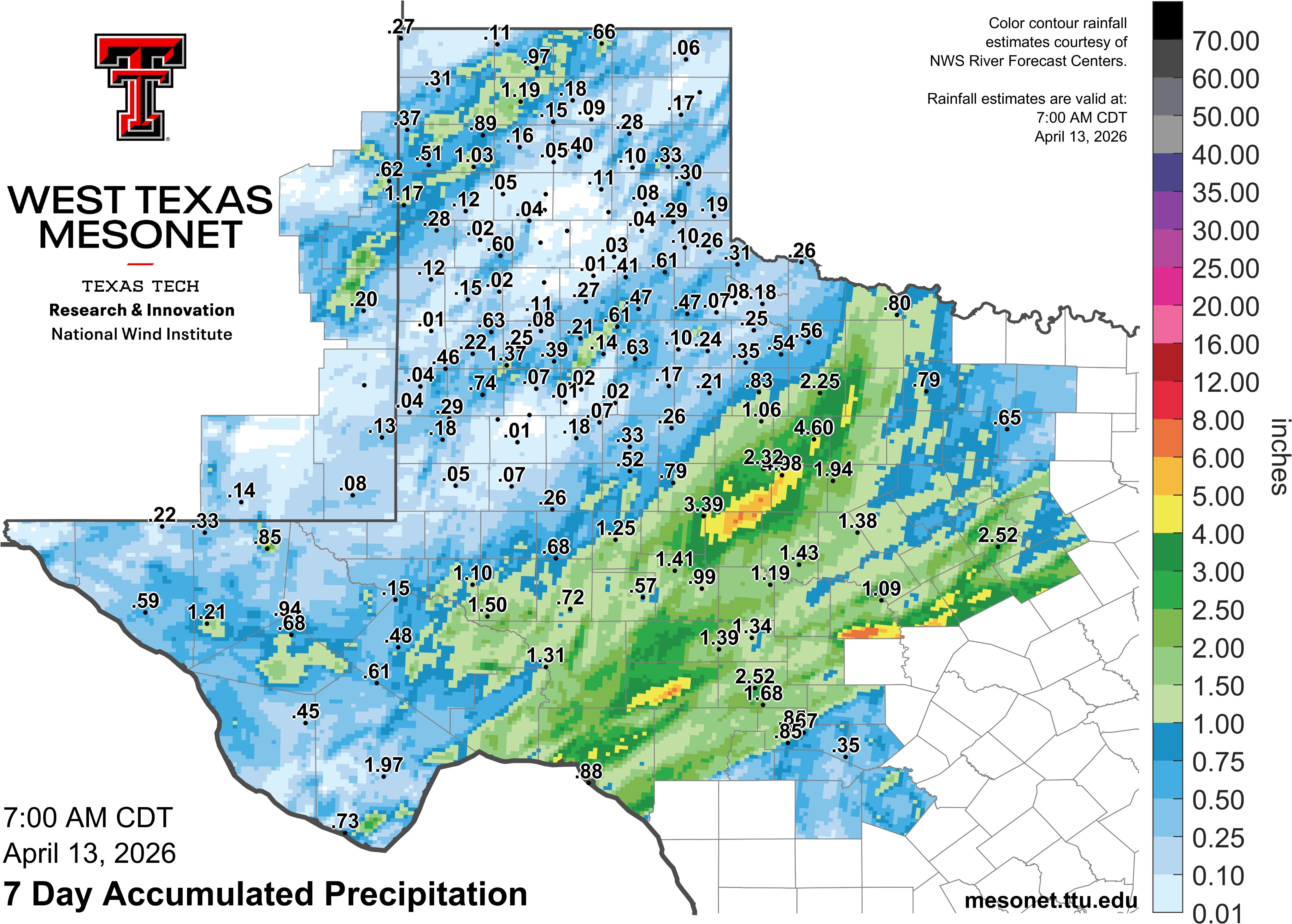 | 7-day rainfall total for much of the western half of Texas, valid through 7 am on Monday (13 April 2026). The data are courtesy of the West Texas Mesonet. | |