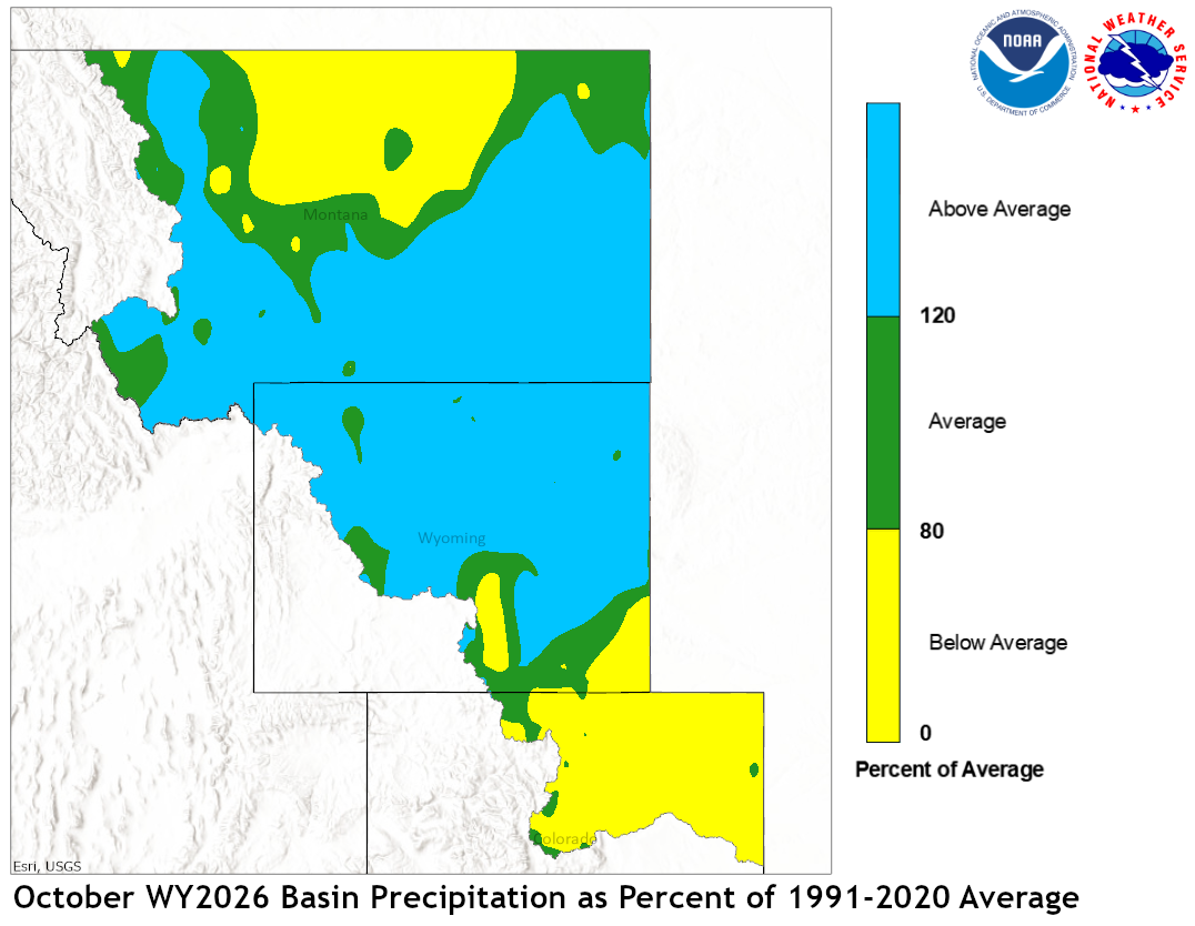 Precipitation during October was above average. The upper Yellowstone River Basin received 149 percent of average precipitation while the Lower Yellowstone River Basin reported 222 percent of average. The Bighorn Basin received 187 percent of average precipitation while the Wind River Basin received 156 percent of average. The Little Bighorn - Upper Tongue Basin received 171 percent of average and the Powder River had 211 percent of average precipitation.