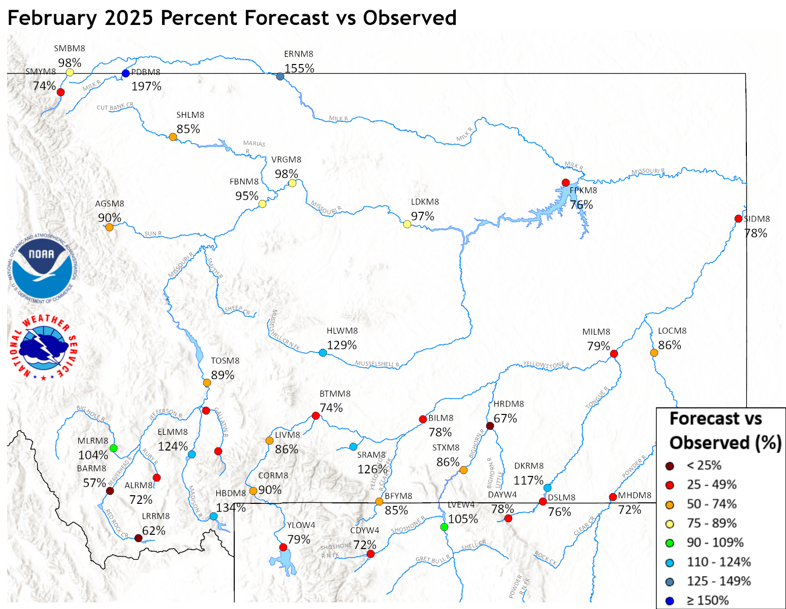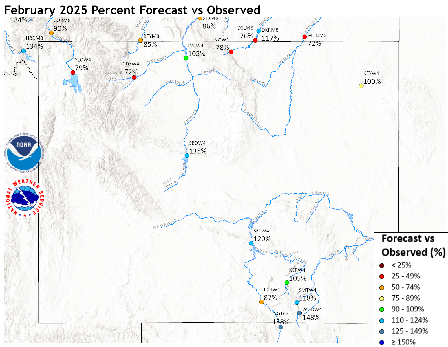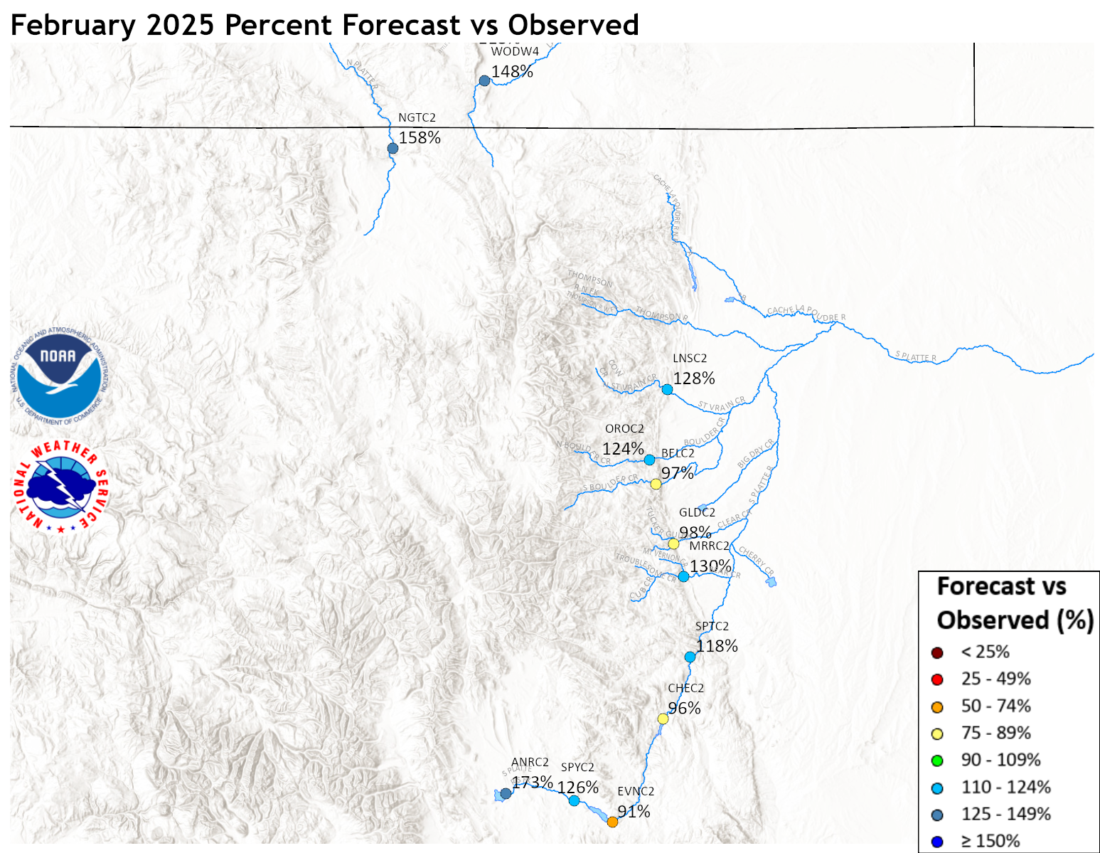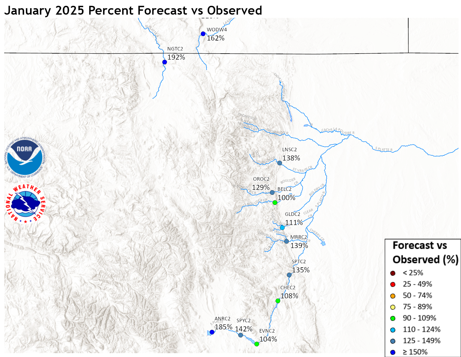 The following are water supply verification graphics that compare the forecasted April - September (seasonal) forecasted volumes to the observed volumes. Seasonal runoff volumes are forecast each January, February, March, April, May and June. The verification graphics are displayed as a percentage and are calculated as the Forecasted Volume / Observed Volume. For example 125% would mean that the forecasted volume for that forecast would be 25% more than what occurred, and similarly 75% would mean that the forecasted volume for that forecast would be 25% less than what occurred. |