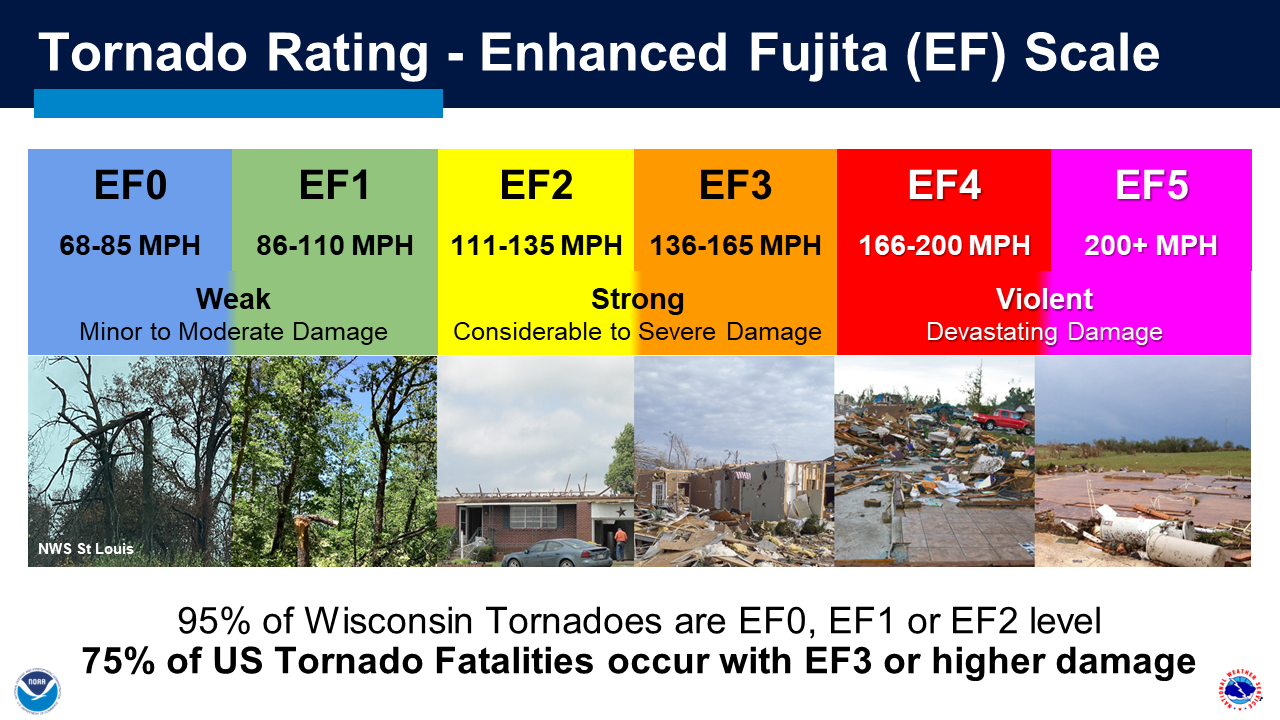 Another hazard of the warm-season is powerful, straight-line thunderstorm winds that can peak at 75 to 150 mph. Every year Wisconsin will get a few storms that generate hurricane-force winds of at least 75 to 100 mph. Severe Thunderstorm Warnings are issued for these wind events, rather than Tornado Warnings. The bottom line is - if you don’t feel safe, head for a sturdy shelter, go the lowest level of the building, and get away from windows and exterior walls.