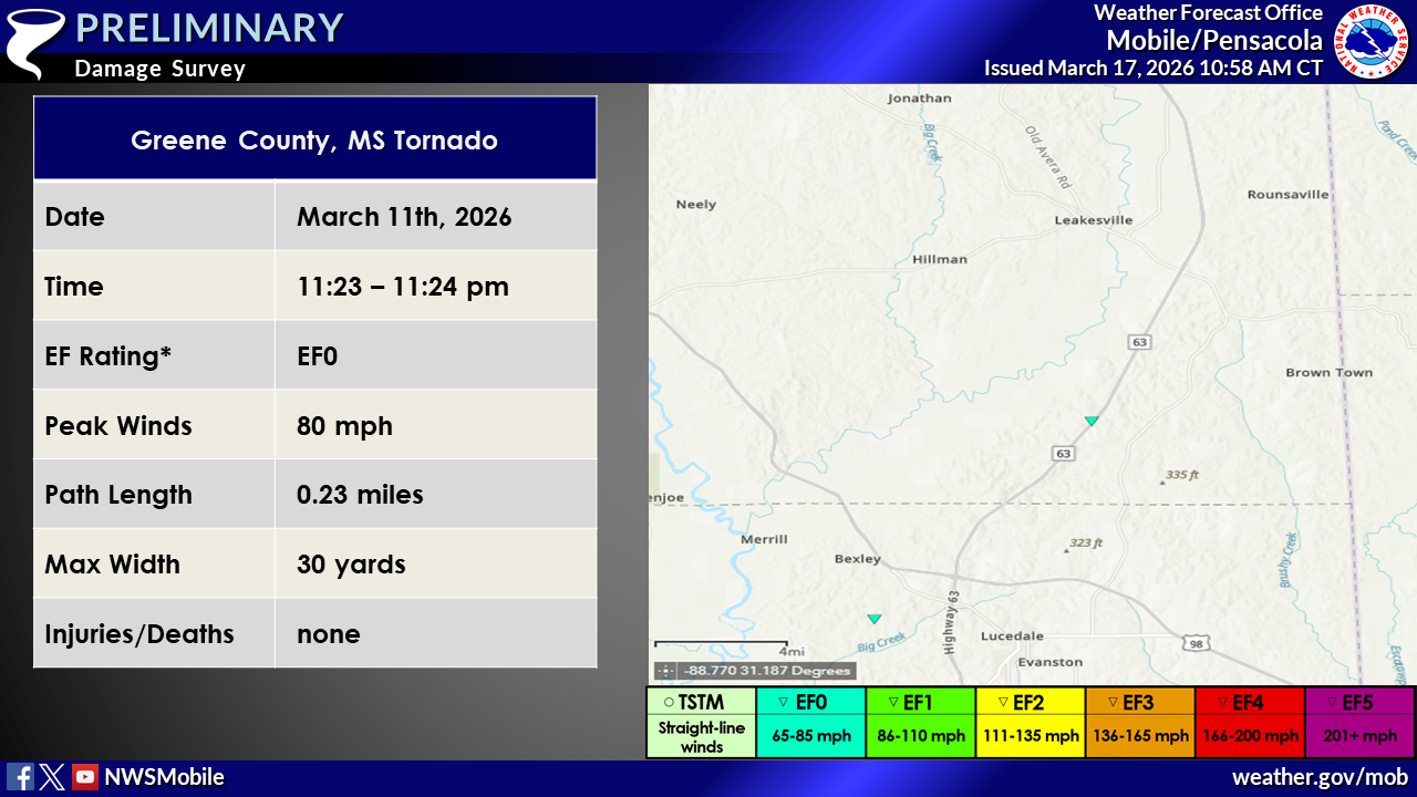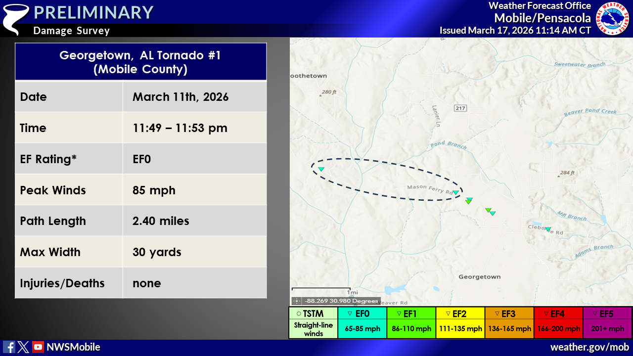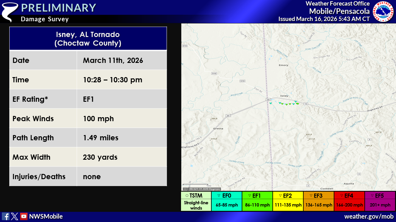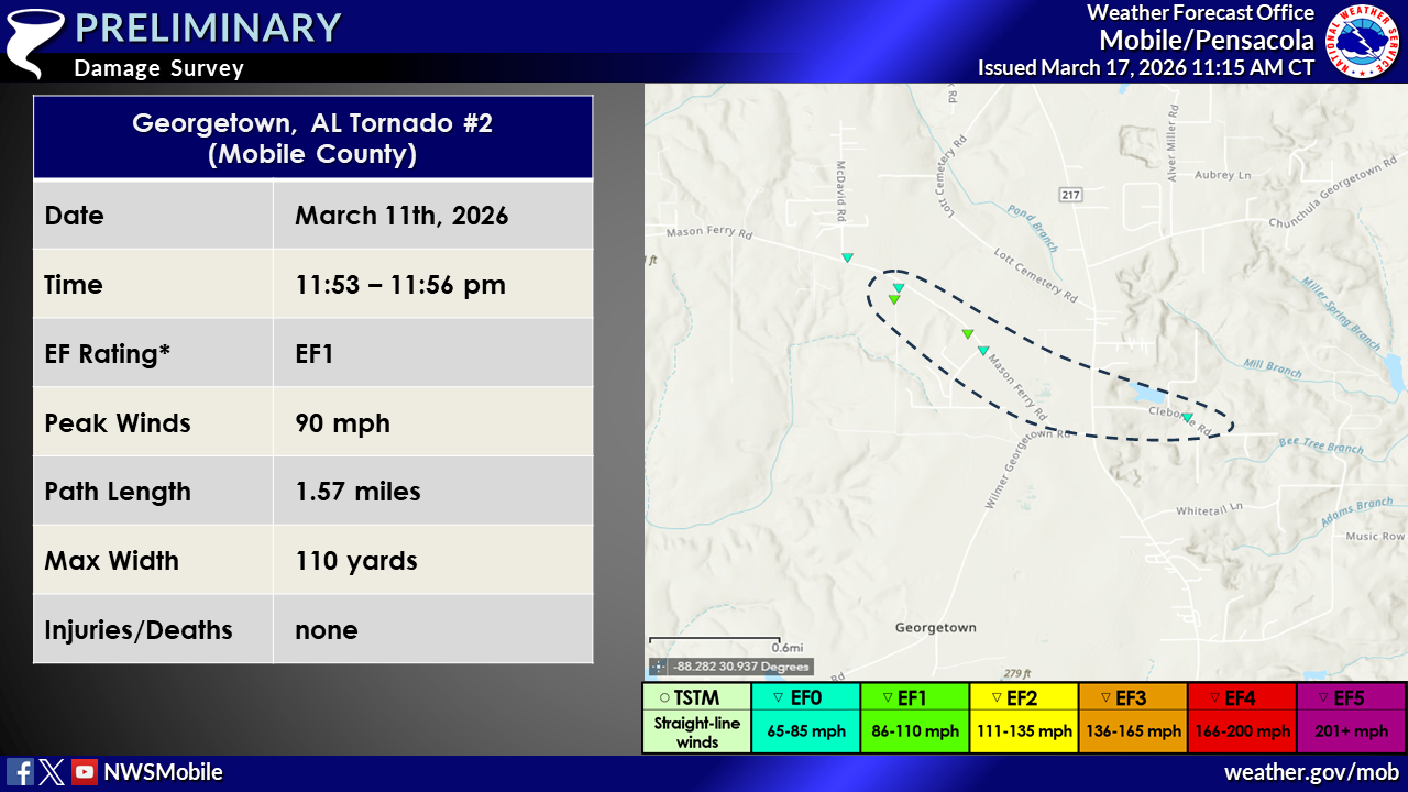 NWS Mobile storm survey teams concluded that there were at least 10 brief tornadoes that were spawned from the first significant Spring storm system for 2026 that rolled through the area late in the evening on Wednesday March 11th to shortly after midnight Thursday morning March 12th. 8 dropped down and impacted the interior and 2 in Mobile County. Of all, 8 tornadoes were rated EF1 and 2 were rated EF0. Please refer to the Local Storm Reports (LSRs) for March 11th and 12th, 2026 to view local and national storm reports.